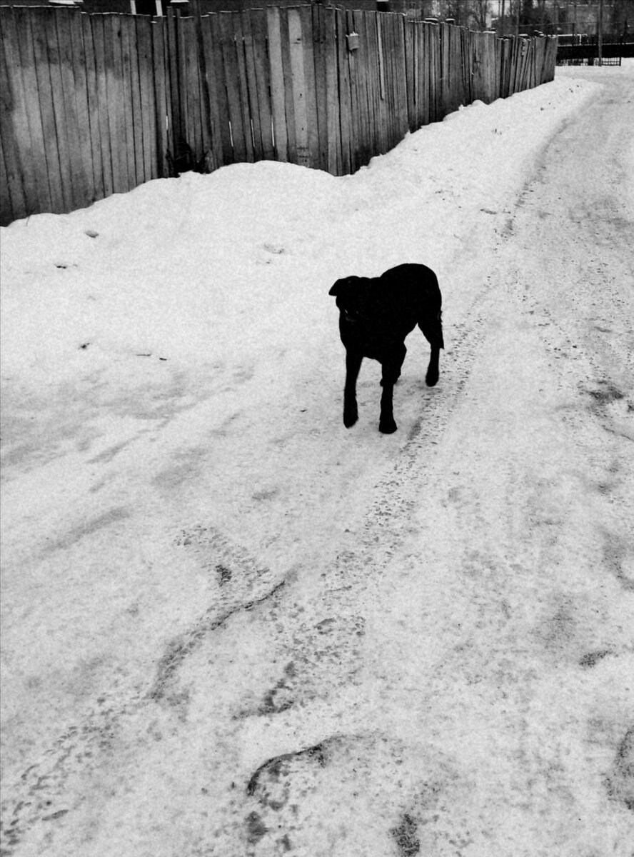 Ходил за хлебом и молоком — и увидал чёрного пса-сироту на белом снегу. Это было настолько красиво и органично, что захотелось снять его, но он пугался и убегал. Красивого снимка не получилось, зато вышло что-то вроде безмолвного разговора, какие-то снежинки понимания и добра промелькнули меж нами. Снег приятно хрустел под ногами, небо, в котором давно нет ни ангела, давило своей чистотой, ждали дела, заботы и страхи. Ангелом был тот чёрный пёс, я догадался. 8.01.2023