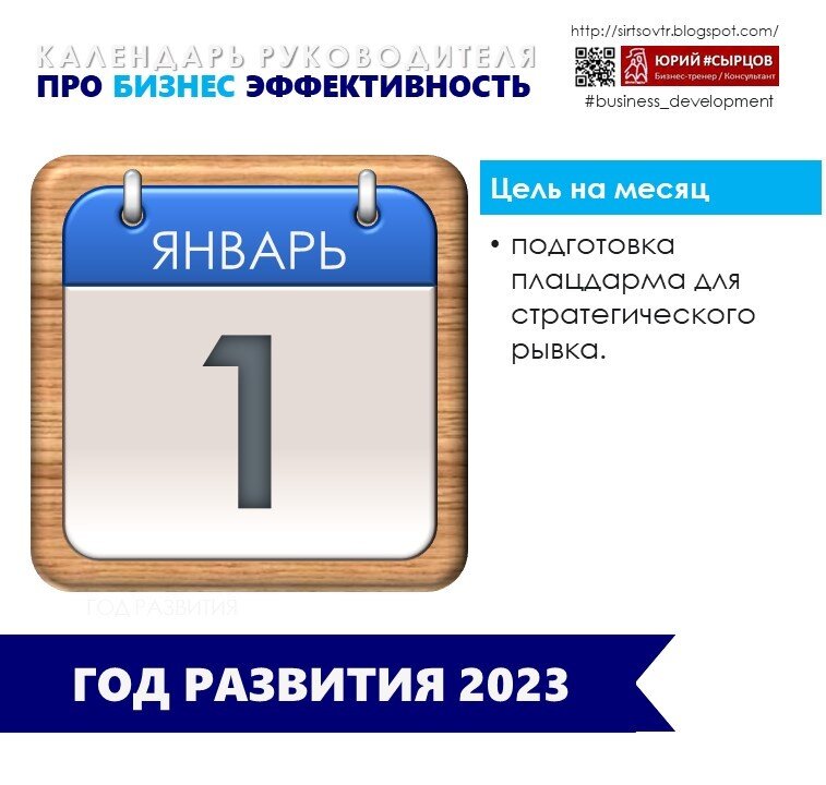 ЦЕЛЬ НА ЯНВАРЬ. КАЛЕНДАРЬ РУКОВОДИТЕЛЯ 2023 #менеджмент #управление #развитие Цель на январь - подготовка плацдарма для стратегического рывка. Стремительные и негативные перемены заставляют либо замереть, либо бежать без остановки. В древности - это было выигрышной стратегией для выживания конкретного неандертальца. Для стратегического развития бизнеса реактивные непродуманные действия - чаще приносят вред. Задача любого руководителя и бизнесмена - перестать действовать реактивно и перейти к проактивному поведению. Эффективные изменения требуют тщательной подготовки, всестороннего изучения и планирования. И чем раньше начать этот процесс, тем быстрее можно будет перейти к активным действиям. Январь самое время провести аудит бизнес-модели, ревизию стратегии, проверку на актуальность продуктовой стратегии. Даже если вы успели в конце года провести стратегические сессии. Стоит вновь взглянуть на их итоги. Насколько мы вписываемся в оформляющийся ландшафт мира, страны и рынка? Готовы ли м