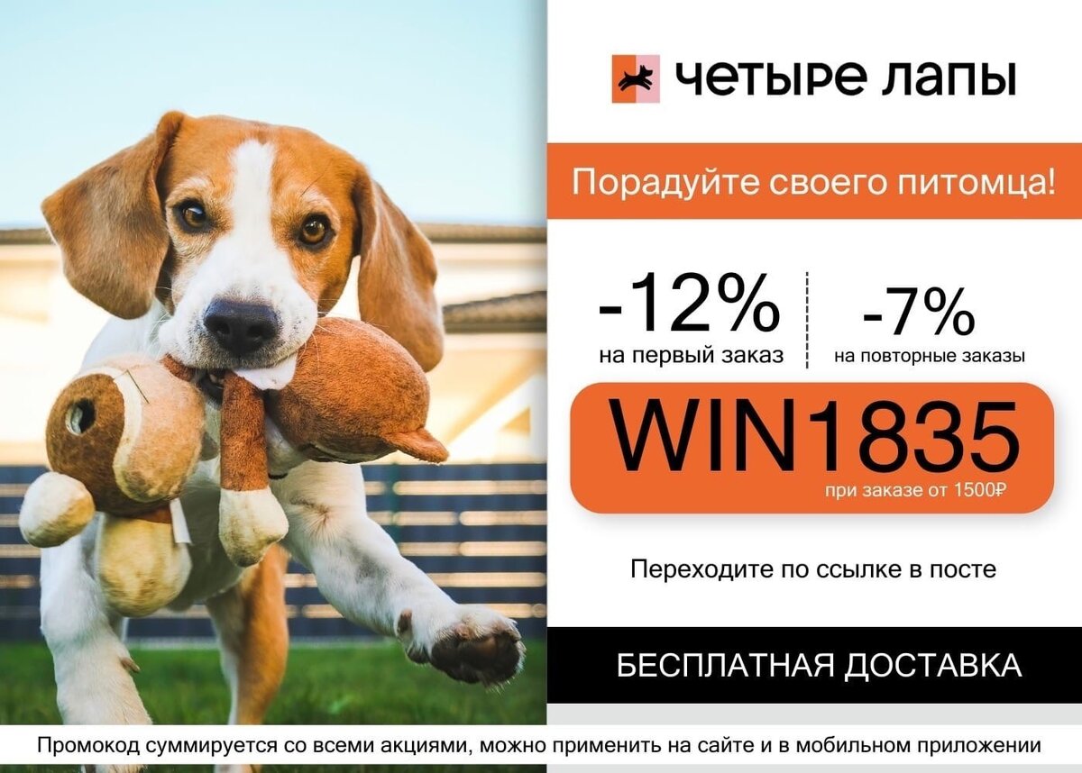 Четыре Лапы, заказывай со скидкой WIN1835 - дает скидку 12% на первый заказ и 7% на все повторные заказы. Переходите на сайт: https://skidki.promo/f445d