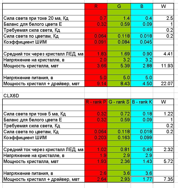 - Пересчитаем силу света с 20 на 5 ма (с учетом того, что на 5 ма эффективность красного светодиода не изменится, а зеленого и синего увеличится примерно на 15% по сравнению с 20 ма)