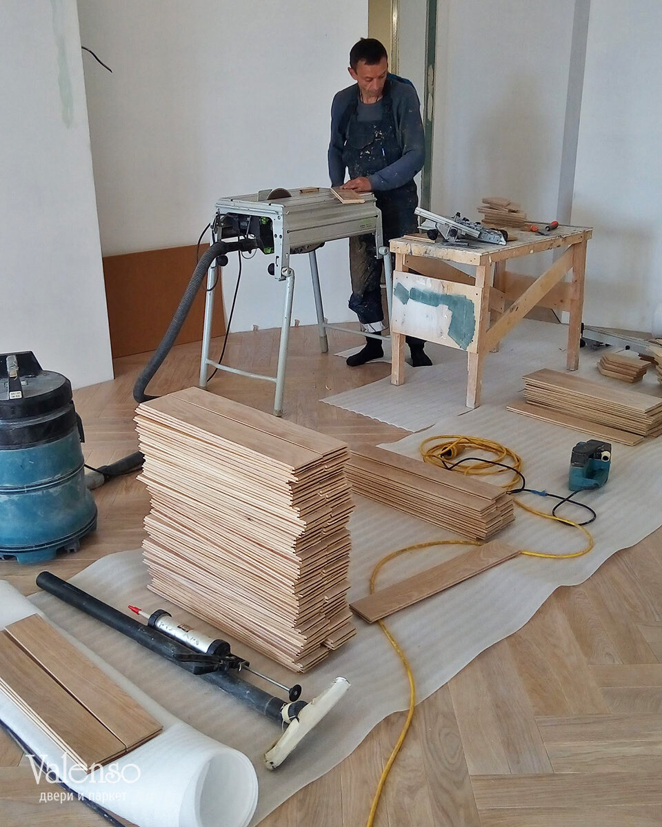 Немного фотографий процесса укладки нашего паркета. Это квартира интерьер которой выполнен в классическом стиле. Расположена она в Санкт-Петербурге на Петровском пр. 5 , ЖК Остров Здесь мы укладываем паркет из натурального дуба в раскладке "двойная ёлочка". На монтаже у нас всегда работают опытные мастера, у которых за плечами большое количество удачно выполненных заказов. Распиловка проводится на собственном оборудовании, в чистоте и порядке. Это штучный паркет из натурального дуба, размером 600х90х15 с фаской. Всего нами было уложено 120 кв.м. паркета. Согласно пожеланиям заказчиков, мы тонировали паркет в необходимый оттенок. Авторы интерьера: Студия Елены Коноваловой, ремонт выполнили ArtSQ. . . . www.valenso.ru | Вконтакте | Telegram