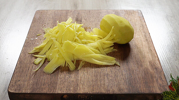 Способ приготовления: Нарезаем картофель с помощью овощерезкой. Выкладываем картофель в чашку и заливаем прохладной водой и промываем его. Растительное масло наливаем в сковороду и обжариваем картофель в масле до золотистого цвета. Выкладываем обжаренный картофель на салфетку. Нарезаем мелко луковицу, выкладываем в чашку. Добавляем соль, сахар, кориандр, яблочный уксус. Добавляем воду, все хорошо перемешиваем. Оставляем на 10 минут. Отварной говяжий язык нарезаем соломкой. Ма