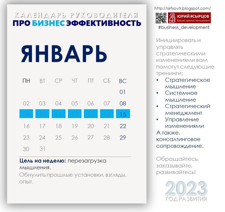 ЦЕЛЬ НА 2 НЕДЕЛЮ. КАЛЕНДАРЬ РУКОВОДИТЕЛЯ 2023 #менеджмент #управление #развитие Цель на 2 неделю - перезагрузка мышления. Чтобы увидеть новые возможности необходимо "протереть очки". Обнулить прошлые установки, взгляды, опыт. Рынок больше не ценит прошлые заслуги. Тем более, что большинство продуктов и услуг, компаний и бизнесов - "дохлые лошади", либо на последнем издыхании. За эту неделю можно успеть: Насыщенная неделька? ;-) И это только проактивная часть. ;-) Не забывайте про регулярный менеджмент и продолжение уже существующей деятельности организации. Руководитель получает больше не за название должности, а за ответственность и бОльшие компетенции. Ну так начните уже соответствовать! Делитесь в комментариях: - Какие стереотипы о компании, рынке и клиентах, есть в вашей компании? - Как часто вы инициируете процесс изменений? - Насколько успешными были предыдущие крупные изменения? Инициировать и управлять стратегическими изменениями вам помогут следующие тренинги: Стратегическое м