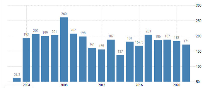 Совсем безнадёжной считается долговая нагрузка = 200% к ВВП, но явные проблемы начинаются при долге к ВВП = 100% и выше.