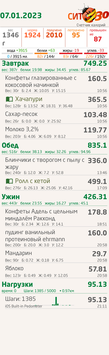Привет! Меня зовут Лина, мне 31 и мой вес 126 кг. В сентябре я весила 138, а в декабре 125. Новогодние праздники оставили свой маленький след 😁. Моя цель - двузначное число на весах. План действий на эту неделю такой: Итог: - 1 кг. за неделю. Отчет за последние два дня будет не честный. Оба дня были продукты «мимо кассы», но если позавчера - это были несколько китайских мандаринок и бутерброд с паштетом. То вчера я даже не помню, что ела. Рот свой успокоить не могла после 9 вечера. Начала «по-божески» с яблочка, а потом все подряд… Вес сегодня ровно 126 кг. Было бы наверное меньше, если бы не бесконтрольное поглощение всего, что не приколочено. Но меню все-таки выложу: Зато с фотографией лучше уже, за два дня фоточек подкопилось. Ещё у меня намечены цели в творчестве, в прошлом году болезни моего семейства в ноябре-декабре расстроили мои планы. А я ведь хотела снова начать преподавать. Надеюсь в этом году моим планам ни что не помешает. Подробнее будет тут: За окном сегодня -28. Поп
