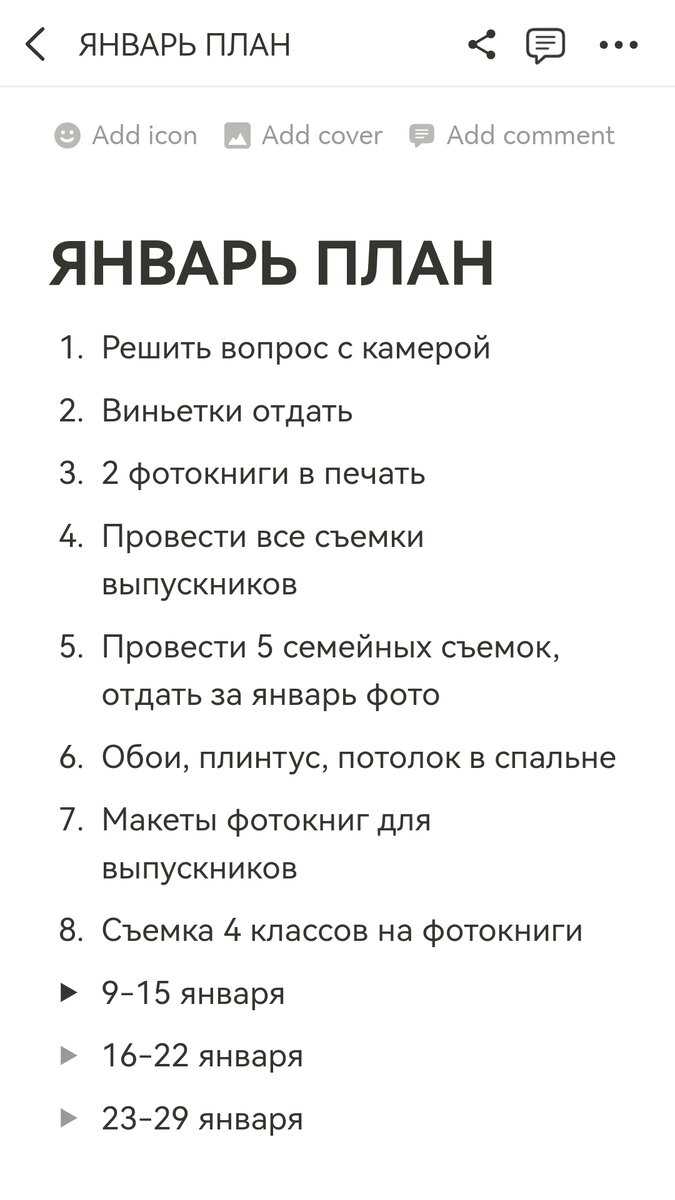Несмотря на то, что уснула я сегодня только в 3, проснулась в 7.30 бодрой и решительной. Младший ребенок пришел от бабушки и потребовал завтрак. Снова залечь под одеяло уже бы точно не получилось. Пока готовится завтрак, просмотрела план на сегодня, составленный ночью. Решила еще сделать списки дел покрупнее, на эту неделю и на весь январь. Все планы связаны с фотосъемками. Начаты они были еще в прошлом году. Чем быстрее закончу эту работу, тем лучше будет для моей нервной системы. Смущает меня, конечно, организация фотостудии, сегодня надо заплатить аренду 11500, а там еще куча работы. И дохода пока студия не приносит. Хотя сьемки школьников там уже проводила. И еще будут в этом месяце. Боюсь повторить ошибки, которые привели меня к печальным финансовым последствиям. Сейчас страх потери денег большой. Рисковать я больше не хочу. Ситуация злит. И моя нерешительность тоже. Пока писала статью, зашла в запрещенную сеть, где уже бесят все своим успешным успехом. Я и сама себя сейча