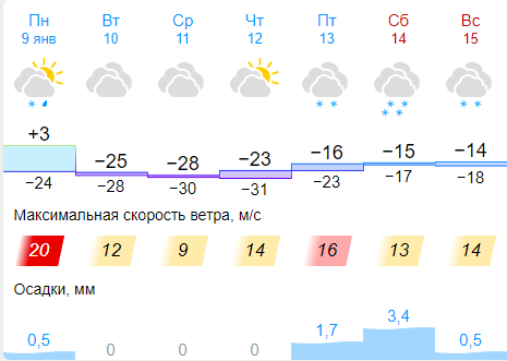 В Новосибирске во вторую неделю января ожидаются морозы до -31 градуса и порывы ветра до 20 метров в секунду. Об этом сообщили синоптики сайта Gismeteo. В понедельник, 9 января днём специалисты прогнозируют потепление до +3 и дождь со снегом. Ночью температура резко снизится до -23 градусов. Порывы ветра достигнут 20 метров в секунду. Во вторник, 10 января ветер стихнет до 12 м/с, осадков не ожидается. Температура воздуха составит -25 градусов днём и -28 ночью. В среду, 11 января скорость ветра снизится до 9 м/с, морозы в течение дня продержатся на отрезке -28...-30 градусов. Осадков не ожидается. В четверг, 12 января ветер усилится до 14 метров в секунду, днём воздух прогреется до -23 градусов, ночью похолодает до -31. Осадков не ожидается. В пятницу, 13 января пойдёт небольшой снег, порывы ветра достигнут 16 м/с. Днём столбик термометра поднимется до -16 градусов, ночью опустится до -23 градусов. В субботу, 14 января снегопад усилится, ветер ослабнет до 13 м/с. Температура воздуха в