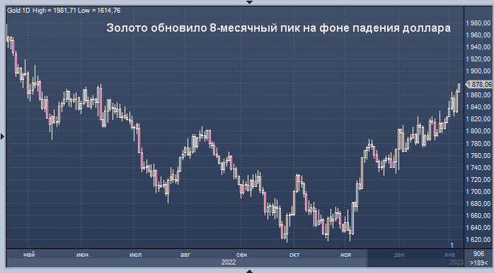 Индекс доллара снизился на 0,3%. Все внимание на Пауэлла и CPI График цены наличного золота интервалами в 1 день Спотовое золото подорожало на 0,7% до 1878,06 доллара за унцию по состоянию на 05:57 по Гринвичу, что является самым высоким уровнем с 9 мая 2022 года. Фьючерсы на золото в США также выросли на 0,7% до 1881,90 доллара. Индекс доллара снизился на 0,3%. "Более мягкие данные по США в пятницу повысили привлекательность золота. Данные свидетельствуют о том, что совокупное ужесточение ДКП ФРС в 2022 году начинает сказываться на экономике и что ФРС может позволить себе замедлить темпы ужесточения", - сказал валютный стратег OCBC Кристофер Вонг. Пятничные данные, свидетельствующие об умеренном росте заработной платы в США и декабрьском сокращении активности в сфере услуг, привели к росту цен на золото почти на 2%. Теперь трейдеры обратятся к речи председателя ФРС Джерома Пауэлла на конференции центрального банка в Стокгольме во вторник и данным по индексу потребительских цен в США,