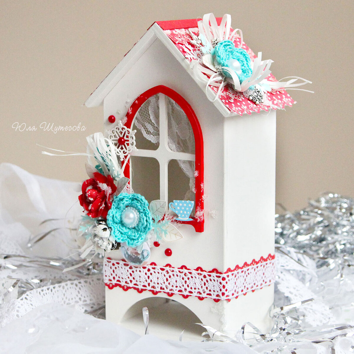 В этой публикации хочу поделиться с вами идей оформления чайного домика, который несомненно украсит любое чаепитие😉 Представленный домики был сделан в качестве декора праздничного стола и для создания праздничной атмосферы. Его я собрала из деревянных деталей и окрасила акриловыми красками. Крыша съемная. Ее оформила дизайнерской бумагой красного цвета и украсила небольшой композицией из вязанного цветочка, рафии, вырубки и подвески в виде снежинки. Сам домик украсила кружевом, цветами ручной работы, рафией, чипбордом, половинками бусин, шишкой, декоративной фишкой с изображением заварочного чайничка, веточками и листиками. В окошке сделала имитацию занавесок из кружева. Кстати, подобный домик может быть еще и оригинальной, необычной упаковкой вкусного чая, который можно презентовать в новогодние праздники или зимний День рождения. Благодарю за внимание к моему творчеству! Юля Шутегова ✨ Меня и мои работы можно найти здесь: 🔸Ярмарка Мастеров (купить или заказать открытку можно здесь)