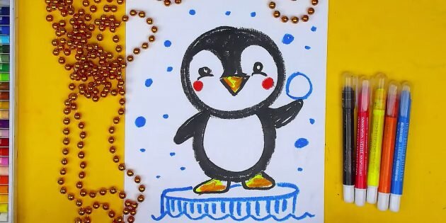 Чтобы показать текстуру, нанесите на льдину вертикальные штрихи. Над лапкой, вздёрнутой вверх, изобразите небольшую окружность. Чтобы рисунок не смотрелся пустым, на белом фоне добавьте точки разных размеров. Это снег.