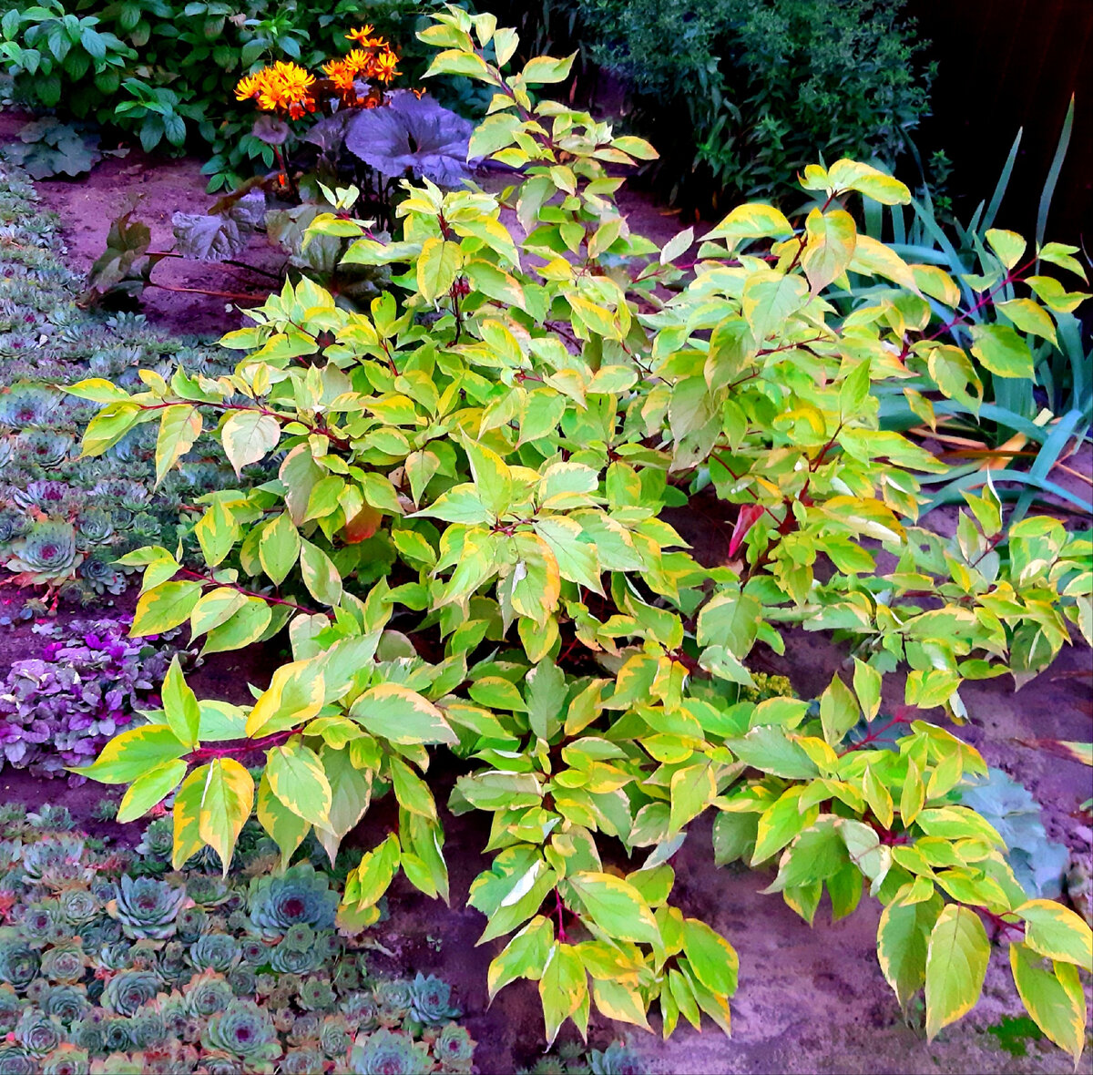 Эти кустики привлекают внимание своими яркими расцветками - и листьями, и ветками. Вот, посмотрите - малиновые ветки и пестрые салатовые листья: Это дерен Гоучаулти. Быстрорастущий кустарник. И изгородь живая невероятно яркая, и один сам по себе хорош! А осенью - вообще огненный! Дерены - жители солнца. А у меня солнца не много - им приходится жить в тени. Видят солнце все три моих сорта пару часов рано утром. И все равно растут. А вот - Сибирика Вариегата: Листва у деренов изумительная! Они украшают сад позитивом - в любую погоду и в любое время года такие цвета супер-ярких оттенков! А у Вас есть дерены? Что яркое растет в саду? Поделитесь идеями - очень хочется из практики😊 Подробнее о Гоучаулти - здесь. Еще о дерене. Еще яркие в моем саду - здесь.
