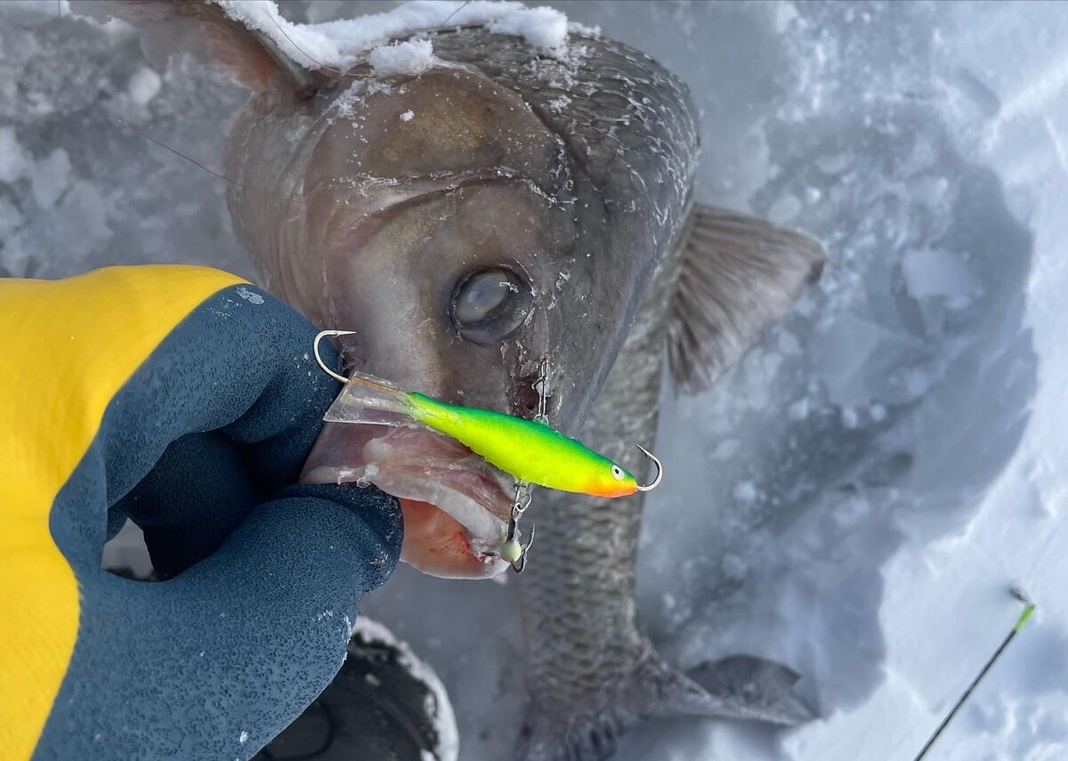 Приехал домой в 11.00. Думаю , что сидеть дома , надо сходить на рыбалку. В 12.30 выхожу на водоем в районе 6 кв , Куйбышевского вдхр. Пошел на свою заветную точку , на водоеме всего 5 рыбаков в доступном обзоре. Небольшой ветерок придавал к морозу -22 еще пару тройку минусовых градусов. Пришил забурился , уже шуриком, лед уже достаточно толстый. И на одной из лунок резкий подъем с глубины 7 м. до 5 м. В эхолоте линия подъема достаточно жирная была. Поклевка , подсекаю и понимаю , что там не стандартный окушок. Начинается борьба , удилка в тандеме с катушкой сделали свое дело. Припарковал в 130-ю лунку и он застрял , пришлось уже рукой вытаскивать. И вот он трофей - Язь на 1,9 кг. на viking 6, цвет 29. Итог рыбалки на фото. Но она и длилась всего по факту 1,5 часа , потом поднялся лютый ветер , камера на груди замерзла и я стал собираться домой. Еле дошел , на водоеме уже никого. В общем ни капли не пожалел , что выбрался на водоем. Всем НЧНХ!