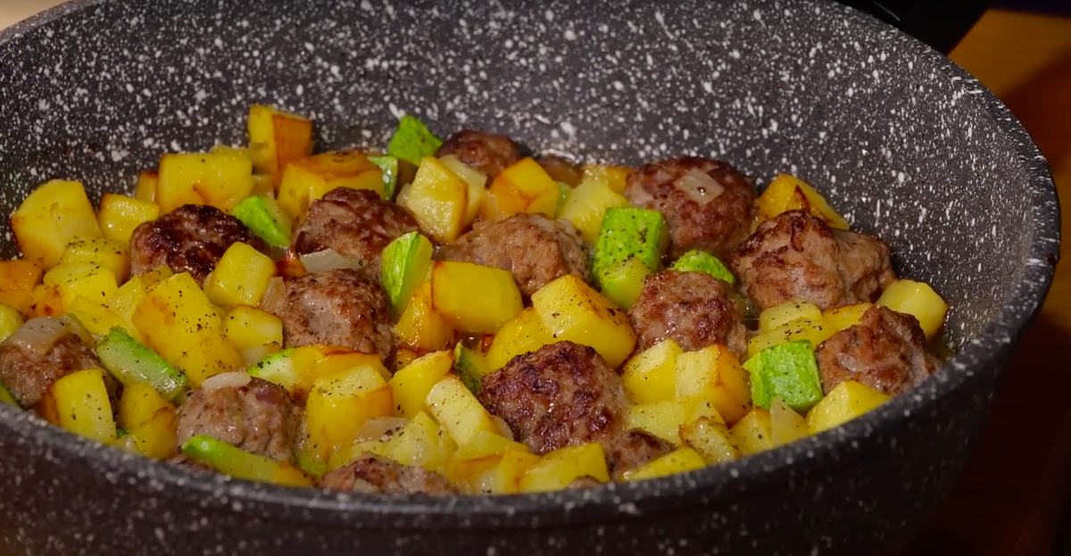 Томаты черри (можно и другие) Приготовление: Берем картофель, кабачок и половинку луковицы нарезаем небольшими кубиками. Обжариваем овощи до полуготовности на растительном масле и снимаем с огня. Фарш по вкусу солим, перчим, добавляем соевый соус и мелко нарезанную вторую половинку луковицы. Фарш хорошенько сбиваем и перемешиваем, добавляем сухой чеснок и снова сбиваем и перемешиваем. Далее из фарша формируем фрикадельки и обжариваем на растительном масле до золотистого цвета. (Совет: перед тем как добавить растительное масло, закиньте на сковородку кусочек сл