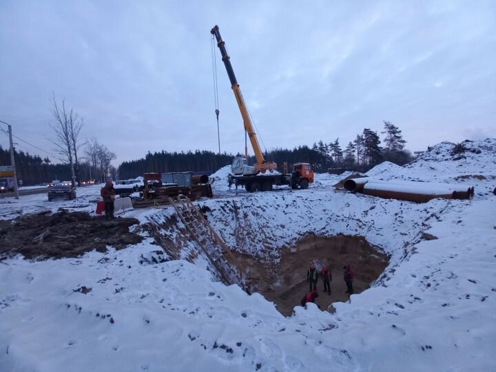 Во-вторых, множество строителей прокладывают трубы, которые пройдут под улицей Остужева со стороны тамбовской трассы. Для этого они вырыли яму глубиной несколько десятков метров. С одной стороны коммуникации уже проложили, теперь укладывают с другой, а затем их соединят.