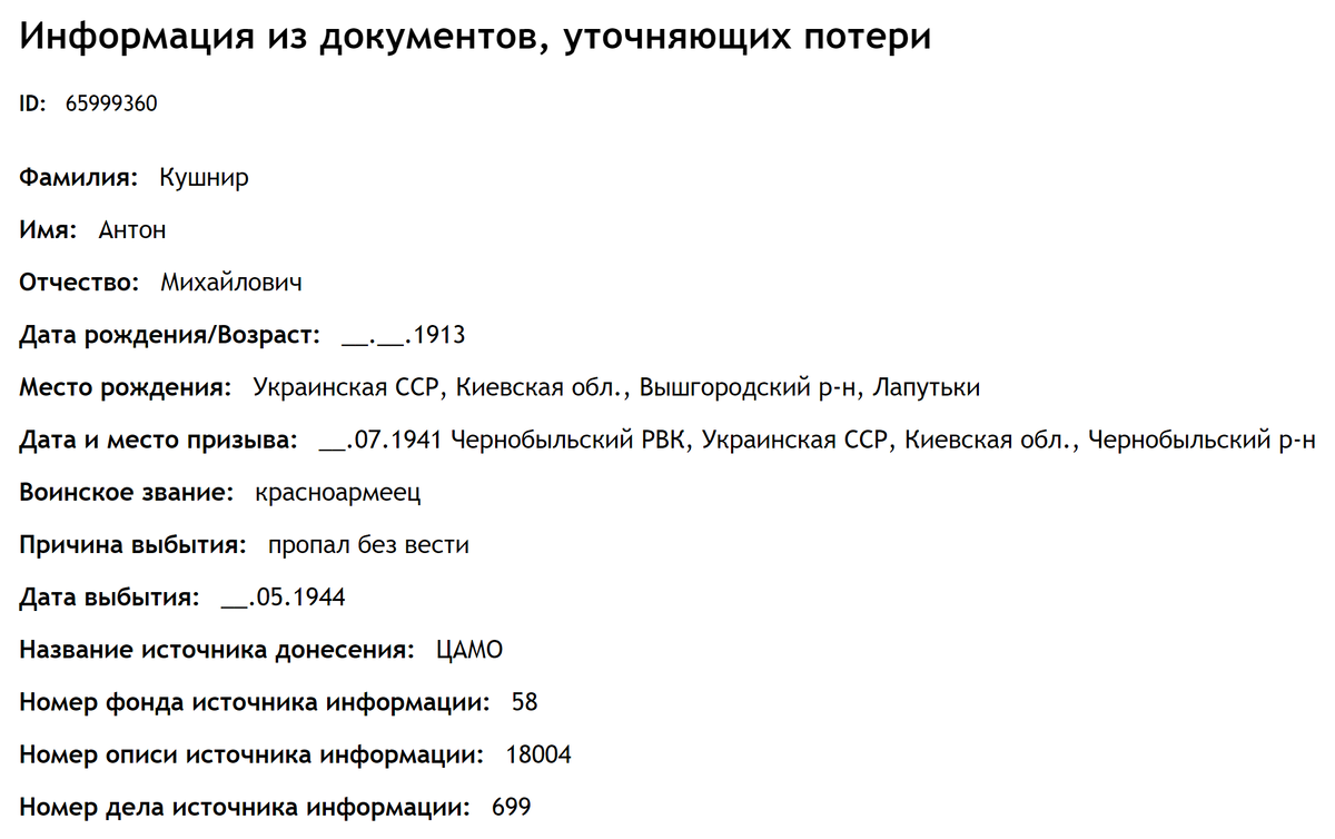 Друзья, сегодня я расскажу вам, чем нам как генеалогам может быть полезен этот сайт. Расскажу я это на примере поиска информации по родному брату моего прадедушки, Кушниру Антону Михайловичу, и брату моего второго прадедушки, Богданову Михаилу Алексеевичу. Подобные данные есть на каждого героя Великой Отечественной Войны, внесенного в базу сайта. Благодаря этому вы можете узнать, в каком году и где родился ваш герой, когда и каким военкоматом он был призван, его воинское звание, а также в случае пропажи без вести или гибели дату этого события и в случае гибели - где он был похоронен и было ли перезахоронение (если было, то в документе написана фраза "первичное место захоронения", то есть место, где он был изначально похоронен). В случае перезахоронения там иногда указывается, под какой мемориал его перезахоронили. Имейте в виду, что в базе вполне могут быть ошибки в фамилии, имени, отчестве, дате рождения и месте рождения по причине человеческого фактора: не так услышали, не так записа