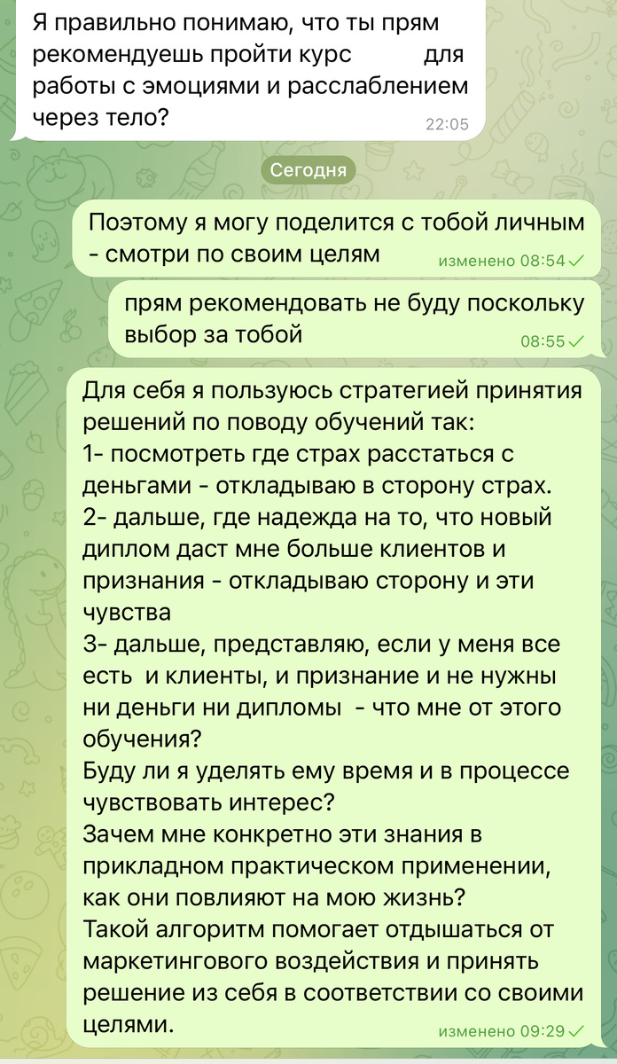 Если вы хоть раз покупали курс и не успевали его смотреть, а тем более делать, то вам знакомо ощущение потери денег. Чтоб не терять деньги и время используйте этот алгоритм и вы будете довольны собой. Стратегия принятия решения по поводу обучений от @NatalinaCoach: 1- посмотреть где страх расстаться с деньгами - откладываю в сторону страх. 2- дальше, где надежда на то, что новый диплом даст мне больше клиентов и признания - откладываю сторону и эти чувства 3- дальше, представляю, если у меня все есть и клиенты (продажи), и признание и не нужны ни деньги, ни дипломы - что мне будет от этого обучения? Буду ли я уделять ему время и в процессе чувствовать интерес? Зачем мне конкретно эти знания в прикладном практическом применении, как они повлияют на мою жизнь? Такой алгоритм помогает отдышаться от маркетингового воздействия и принять решение из себя в соответствии со своими целями.
