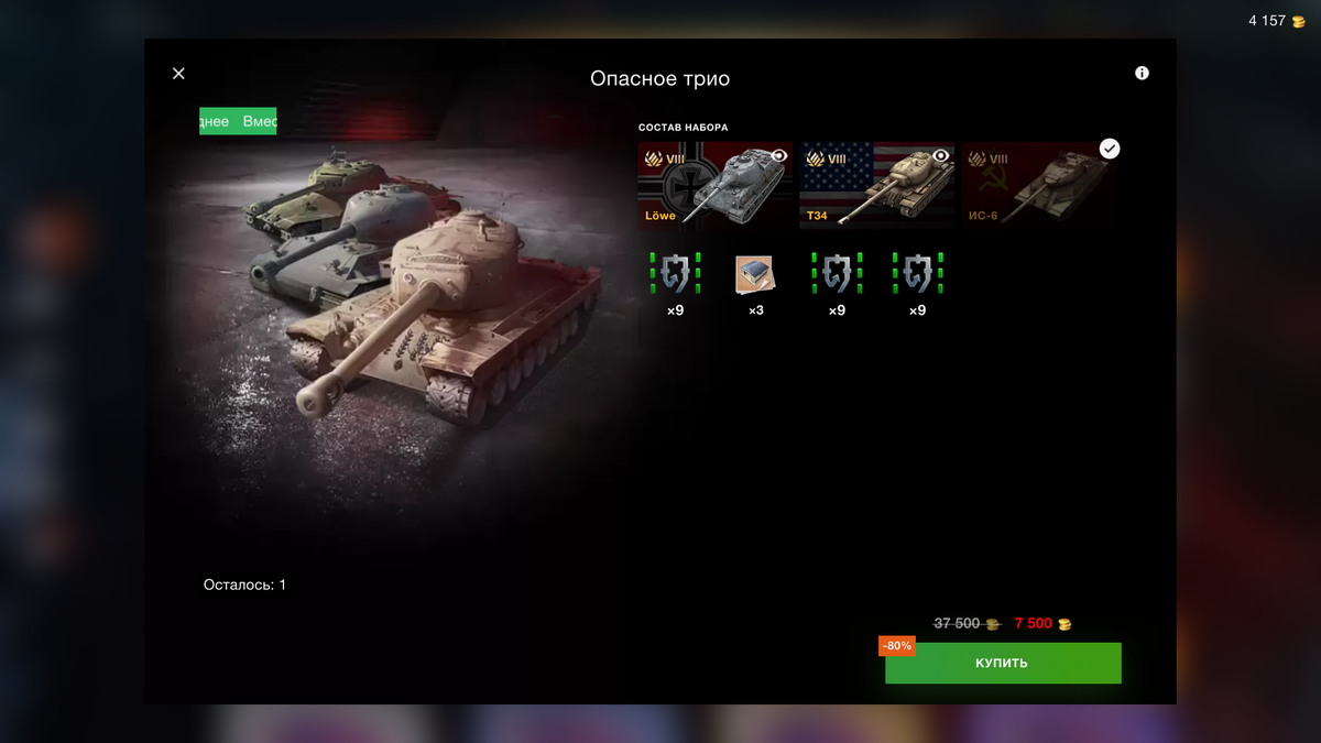 Вот, новые наборы в магазине. Завезли набор сразу с 3 танками за 7500 голды. Причем все танки - восьмерки. Что-то тут не так, скажете вы, сейчас и узнаем. Тут есть Лев, Т-34 и ИС-6. Вроде не самые плохие танки, но почему такая цена. Вроде же машины хорошие, но сейчас будем разбираться. Я не буду прям в красках это расписывать, а скажу прямо. Уже все эти три танка стали мусором, ну вот не играбельные они сейчас. Lowe - очень старый танк, он хоть и имеет точное и пробивное орудие, но все же, ДПМ тут не самый лучший, а броня большей частью посредственная. НЛД и башня спокойно пробиваются, но вот, динамика тут соответствующая. Он едет медленно, а еще очень огромный. Т34 - один из классный ТТ8 прошлого, на нем многие фармили, так как пробитие на основных подобно ПТ - 248 мм, но вот ДПМ и точность далеко от ПТ, скорее от КВ-2. Башня у него крепкая, многим восьмеркам ее сложно пробить, но уязвимые зоны все еще есть. Корпус тут совсем хлипкий. Но зато УВН в -10 и можно играть от рельефа. Иг