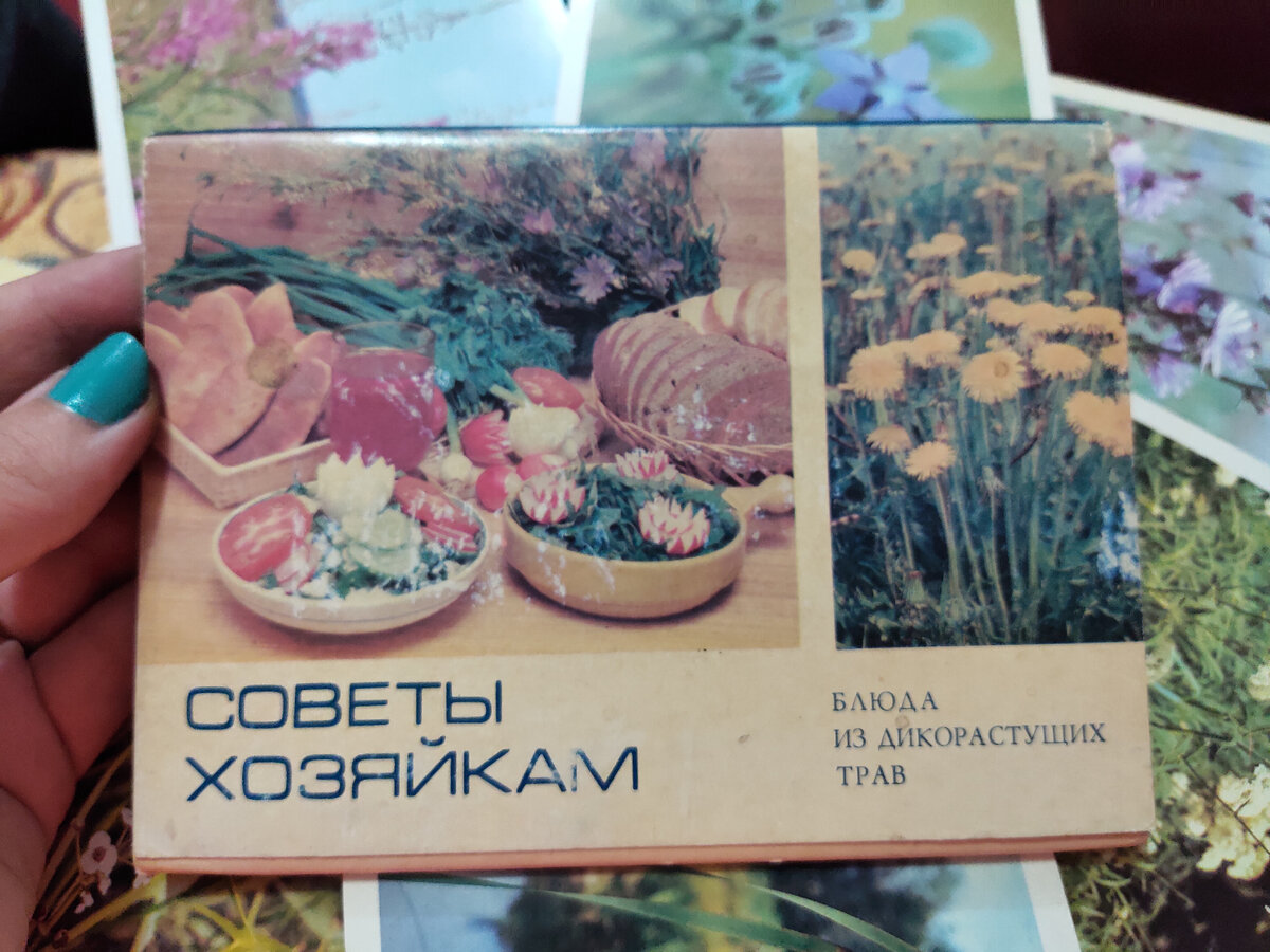 Помните, были такие наборы открыток с самым разным - видами музеев, городов, тематические к празднику. Вот мне попался такой набор. Называется он "Советы хозяйкам. Блюда из дикорастущих трав". Даже я такого не видела. Советы полезные, но боже мой, надеюсь, что никогда у нас не будет повода заменять лопухом картофель или делать муку из корней рогоза широколистного, по простому камыш (ну у нас так в селе его называли). А рецептами все же поделюсь. Они не все не подходящие, некоторые часто применяю. Жаркое из лопуха не желаете? Написано, что в корнях лопуха содержатся вещества, позволяющие заменять им картофель, свежие листья можно использовать для варки супа или приготовления салата. Ну не знаю, мне запах лопуха катастрофически неприятен, а уж корни вареные те вовсе воняют. Знаю, поскольку выкапывала и делала себе настой для укрепления волос. Но на безрыбье и рак рыба. Вот, оказывается, ели и лопух. Салатик из победного лука А вот победный лук или черемша действительно вкусный. Весно