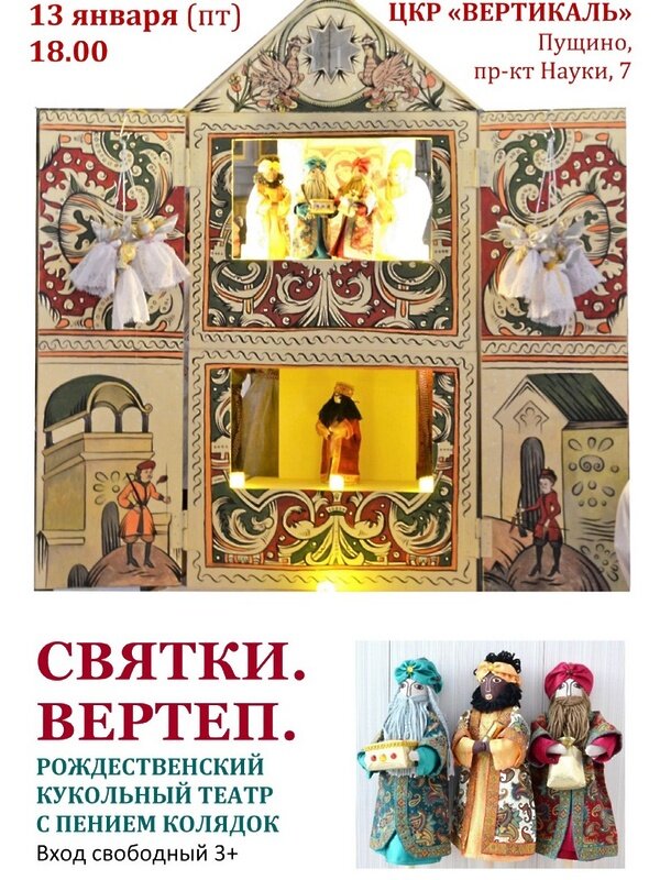 В ЦКР «Вертикаль» Пущине 13 января пройдет рождественское кукольное представление «Святки. Вертеп». Показывать кукольное представление будет воскресная школа «Вертоград» пущинского храма Михаила Архангела. Организаторы приглашают взрослых и детей от трех лет. Вход свободный, начало в 18:00. Вертепный театр на Святки – традиционное народное искусство. Вертепом изначально называли пещеру, в которой родился Младенец Христос, позже слово стали использовать для обозначения переносного кукольного театра, в котором показывали кукольную мистерию. Вертепы стали использовать в древности, самый старый вертепный ящик, найденный на территории России, соорудили в 1591 году, то есть в Российской империи вертепы появились в XVI веке. Вертепные ящики на Руси делались двухъярусными: на верхнем ярусе показывали события, связанные с миром Горним (духовным): это само Рождество Христово, благовестие ангелов, поклонение пастухов и волхвов; на нижнем ярусе представляют царство зла с коварным Иродом, его воино