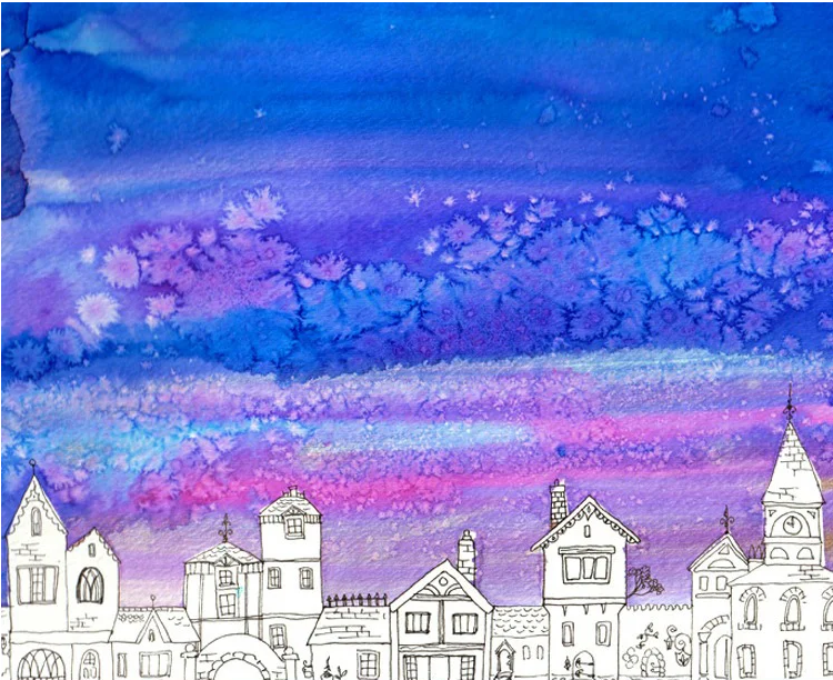 Эти невероятно красивые, загадочные по своему исполнению и таинственные по атмосфере картины сможет нарисовать совершенно любой ребенок, даже самый маленький. Мы поделимся с вами секретом, но только вы о нем не рассказывайте своим гостям – держите интригу, так сказать. Вам понадобится акварельная бумага, малярный скотч, акварельные краски, тонкий маркер и... соль. Обычная поваренная соль. Только крупная. Нарисуйте внизу домики – городской или деревенский пейзаж. Здесь, конечно, понадобится помощь взрослого. Нарисуйте сами или распечатайте и приклейте те, что найдете в интернете. Над ними мы будем творить ночное небо. Чтобы домики не закрасились случайно акварелью, залепите их малярным скотчем. Маленькая хитрость: кусочки скотча сначала прилепите к какой-нибудь ткани, отлепите и уже такой вот не первой свежести скотч наклейте на домики. Это важно сделать, чтобы потом, когда с готовой картины вы будете отдирать скотч, он не утащил следом ваши домики. Слишком хорошо приклеивающийся скотч