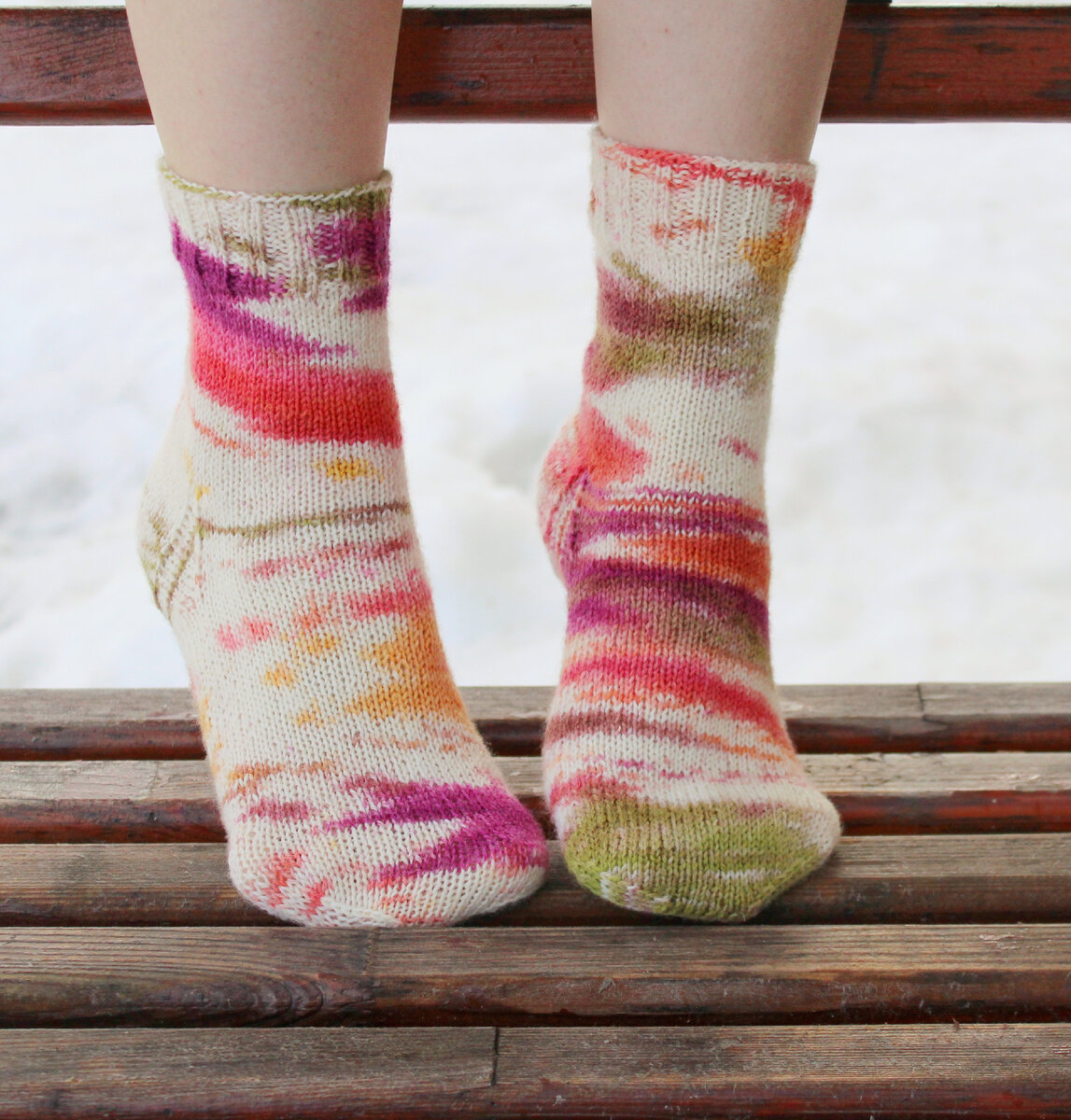 Schoppel - немецкая пряжа. Wunderkleckse в переводе с немецкого значит «волшебные пятна». Первое, что бросается в глаза, это смотка клубка и лёгкие волны нити в клубке. И неспроста! Wunderkleckse окрашивается в вязаном полотне, а потом распускается и сматывается в клубки. Необычная технология окрашивания, цветными пятнами по полотну, делает эту пряжу трудно прогнозируемой в плане окончательного результата. Да, на этикетке даётся примерный вариант чередования цветов. Но он только для понимания, какие оттенки вам встретятся внутри. Ни один моток, даже аналогичного цвета не похож на другой, цвета различные даже с одним артикулом и одной партией. Поэтому получить одинаковые носки просто не возможно. Идеально ровной толщины ниточка. Ни одного узла в одном моточке. Когда вяжешь, петли кажутся не ровными, но после ВТО все становится идеальным. Пряжа мягкая, приятная на ощупь. Нисколько не колючая! Одного мотка хватит на пару взрослых носков примерно до 46 размера. Данные