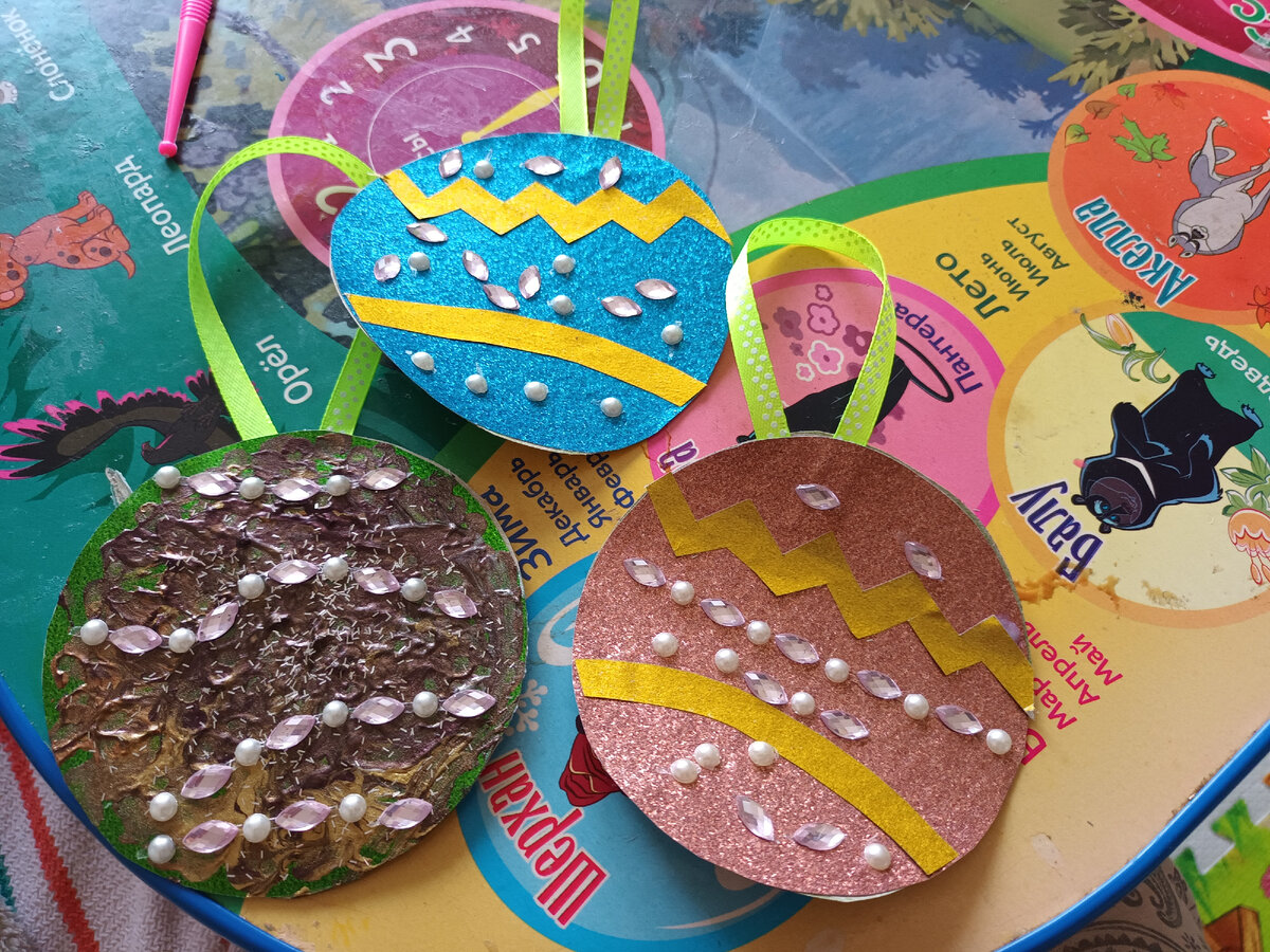 Добрый вечер всем! Новый год уже прошёл, а у меня осталась куча неописанных поделок и развивашек на эту тему. Поэтому с вашего разрешения буду продолжать её до старого Нового года. Вот такие игрушки Оля приготовила бабушке, дедушке и дяде Лёше (моему брату) на Новый год. И они заняли достойное место на нашей новогодней елке. Склеили мы их за двадцать минут, подготовка тоже минимальная. За то, сколько гордости было у ребенка, когда он вручал сделанные собственными руками поделки. И здесь не только развитие и моторика, но уверенность в себе, гордость за себя у дочки и у меня за нее. В общем, самооценку. Поэтому я вижу только плюсы в нашей с дочкой занятиях. Причем малышка тоже пыталась нам помочь и принимала участие в нашей работе. А ещё хотела из собственного опыта сказать мамочкам. Все вы, наверное, знаете, слышали и читали, что если у ребенка проблемы с речью, то все в один голос рекомендуют заниматься мелкой моторикой. И мы бежим покупать мозаику, пластилин и прочее. Так вот, обы