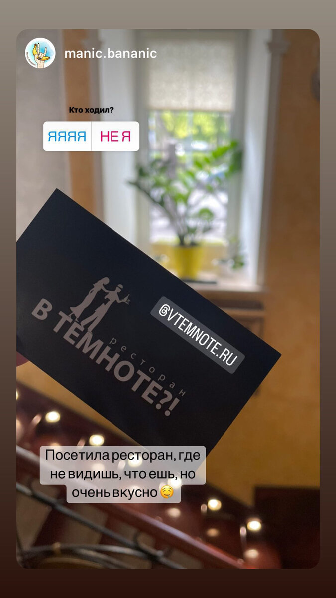 Спасибо за то, что делитесь с нами и вашими друзьями эмоциями после посещения сеанса в кромешной темноте🖤 А если вы еще не были у нас в гостях, то ознакомиться с тем, как проходит сеанс в темном зале нашего ресторана «В Темноте!?», вы можете в VK в статье по ссылке: https://vk.com/@vtemnote_ru-kak-prohodit-seans-v-temnom-zale