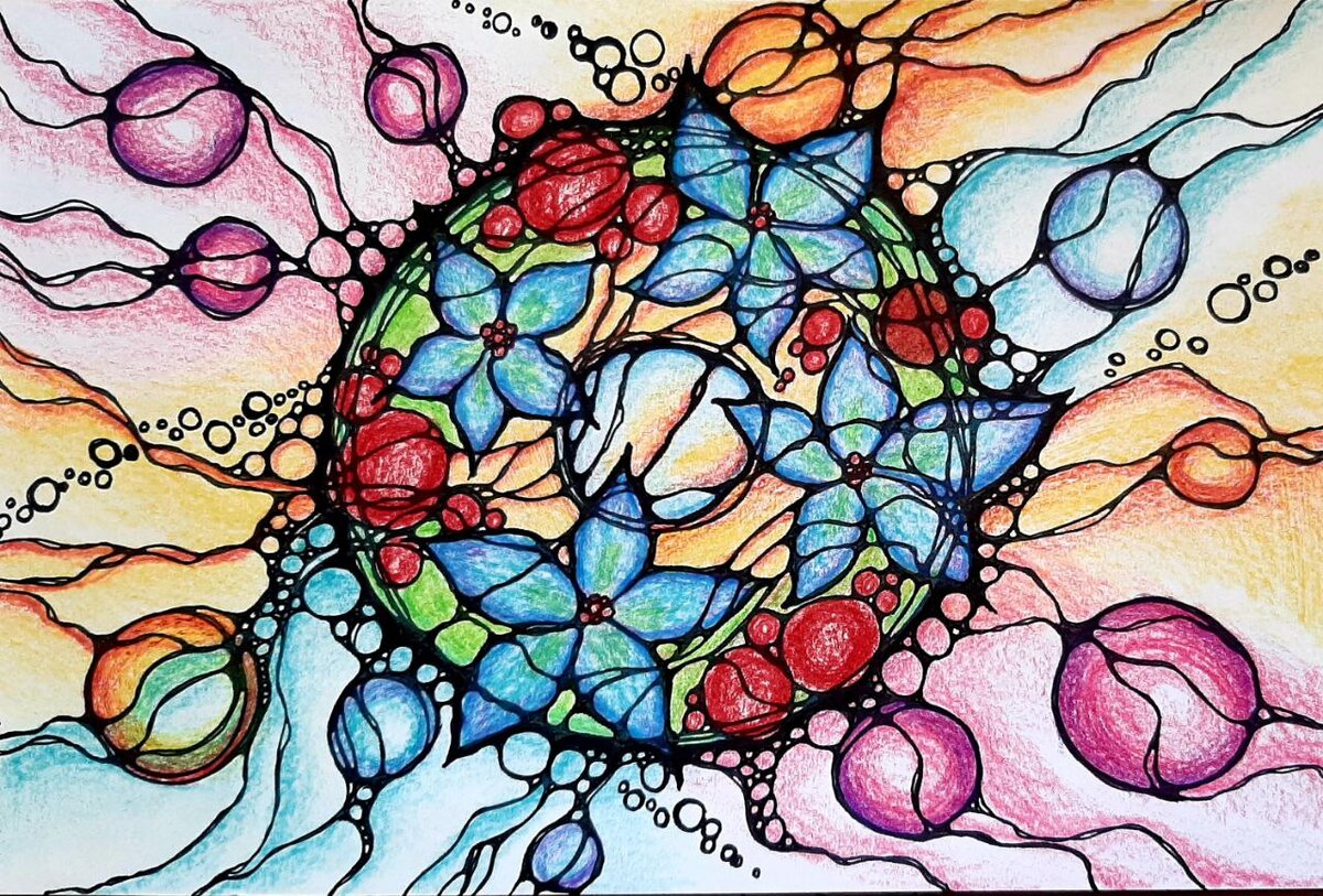 Взяла за основу образ рождественского венка из мастер-класса Людмилы, но наделила его своими смыслами. Венок-это я и муж, цветы на венке-наши четверо детей. Очень хотелось нарисовать наше родительское благословение и поддержку детям, а также поддержку и благосклонность к ним внешнего мира. Рисунок мне нравится, но не исключаю, что через время захочется ещё над ним поработать.