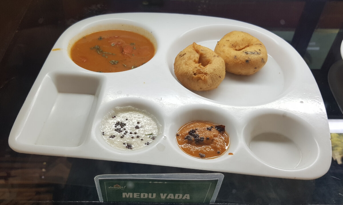 Индия - большая страна, с огромным населением, которому всегда куда-то надо ехать. Для этой цели в стране построено много платных автомобильных дорог, которые на удивление хорошие. Естественно, вдоль дорог имеются места для перекуса. Вот в такое придорожное кафе гид меня и завез по пути из Агры в Дели. Для местных это было обычное заведение, где они могут заказать "комплексный обед" в индийском стиле. А для меня это кафе стало подобием музея современной индийской уличной еды. Все комплекты еды были представлены на витрине с названиями, я их сфотографировала, а затем поинтересовалась в интернете, что это такое. Ведь попробовать всё невозможно! Меду вада Так называются пончики, которые лежат справа вверху. Название переводятся как "мягкие пончики", потому что внутри они должны быть мягкими (я не проверяла). Они приготовлены из черной чечевицы. Тхали Слово тхали означает «тарелка» или «поднос». По сути это набор из нескольких блюд. Обязателен рис и чечевичная похлебка. Идли Идли -