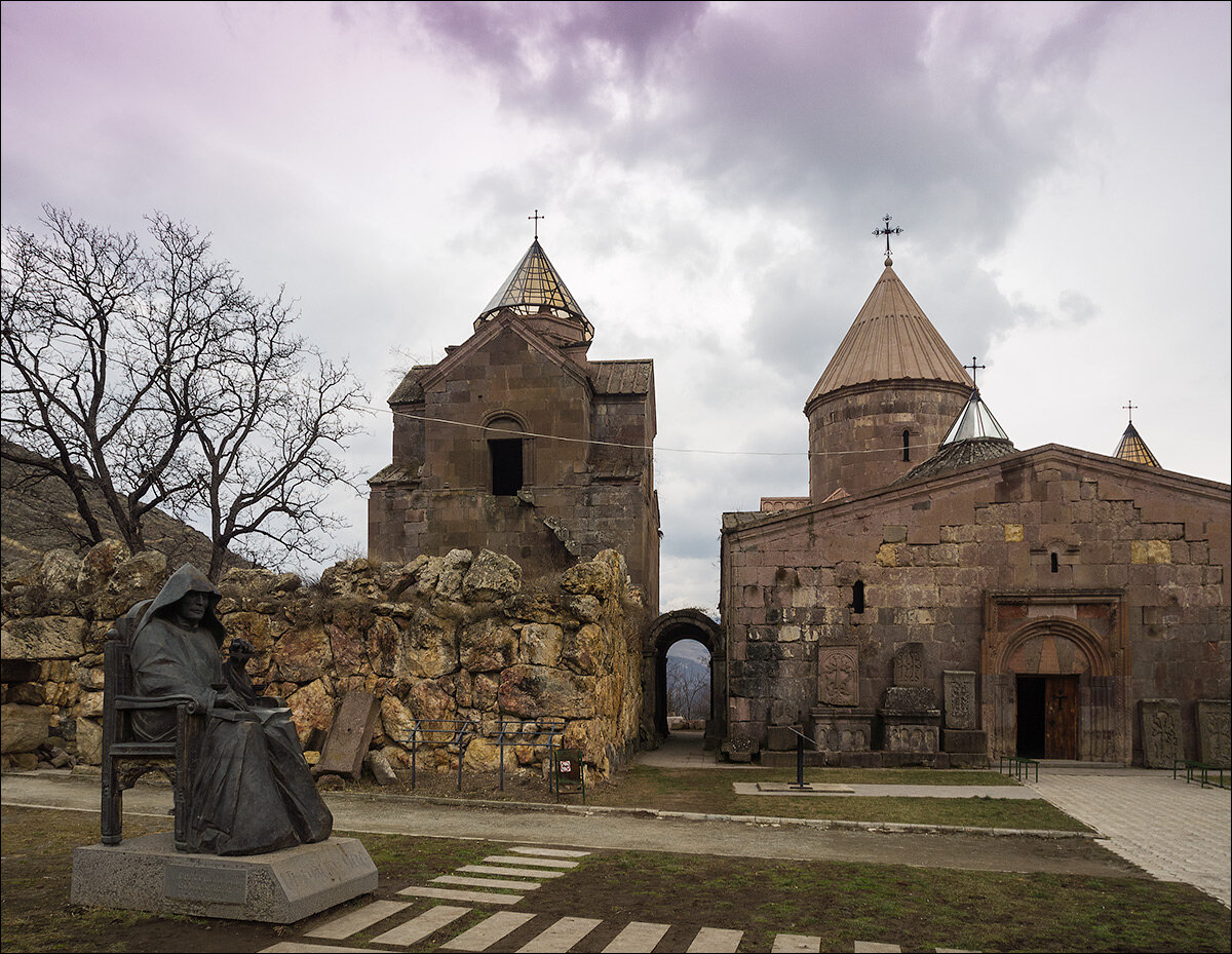 А перед монастырём сидел, держа в руках весы на манер Фемиды, каменный монах в капюшоне, с ехидным, как нам показалось, выражением на суровом лице. Это, собственно, основатель монастыря — Мхитар Гош — мыслитель, литературный и общественный деятель, богослов и священник. «Американская энциклопедия» причисляет Гоша к одним из виднейших представителей армянского Возрождения, а британский учёный Д. Лэнгставит ставит его произведения в один ряд с баснями Эзопа и Лафонтена.