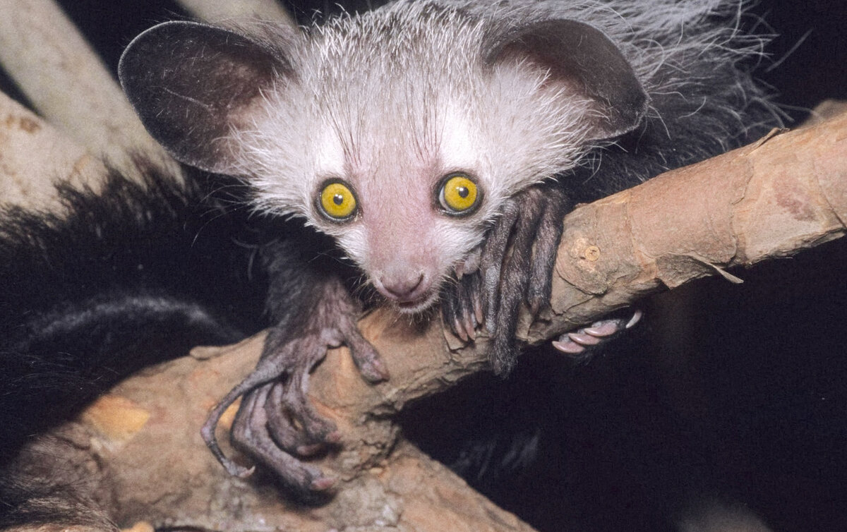 Полное имя животного Мадагаскарская руконожка Айе-айе или просто руконожка. Млекопитающие обладает пушистой шерстью с чёрным или бурый окрасом, длинным хвостом и причудливыми тонкими пальцами. Преимущественно животное ведёт ночной образ жизни, в тропических лесах острова Мадагаскар, занесён в красную книгу. Вид этих животных был открыт в 1780-м году. Велись долгие споры, из-за своеобразного строения челюсти животного. Их относили к грызунам, но учёные пришли к заключению что это вид приматов, отклонившейся от общего направления развития. Название этого причудливого создания, произошло в честь французского натуралиста Луи Жан Мари Добантона. Общий вес зверя составляет около 3 кг. Его строение длиной до 50 см. Хвост может достигать 60 см в длину. Круглая большая голова с укороченным лицевым отделом, украшена глазами и большими ушами. Зубы Руконожек Ай-ай напоминают грызунов, от чего клыки после смена молочных зубов - не сохраняются, в отличие от Резцов. Они продолжают расти преимуществен