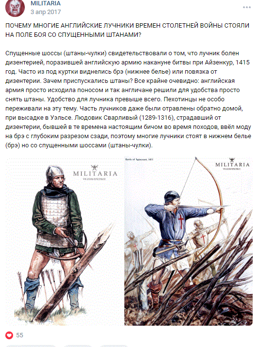 Иногда сложно понять, где правда, а где вымысел, но частенько люди подхватывают какие-то нездоровые сенсации и начинают их гонять всему Интернету. Так получилось и с английскими лучниками при Азенкуре. В том числе эта история попадалась и на паблике Militaria, где меня, конечно же, забанили, когда я в очередной раз уличил админа в том, что он несет чушь. Сам пост: Теперь по пунктам. Во-первых, самое, пожалуй, очевидное. "Общевойсковые" луки конечно, не настолько тугие, как думается некоторым, но все же это не прутик с веревкой... И те, кто хоть раз подхватывал кишечный грипп или еще какую гадость знает, что после длительного общения с белым другом и обезвоживания и ходишь то с трудом, а тут, понимаете, натянуть лук! (точнее, тягать его продолжительное время) Да, войско Генриха Пятого действительно болело дизентерией, но к тому времени болезнь, скорее всего, прошла (унеся немало жизней). Посему, если были уже выздоровевшие, то они ничем таким не страдали, а если страдали - то делали это