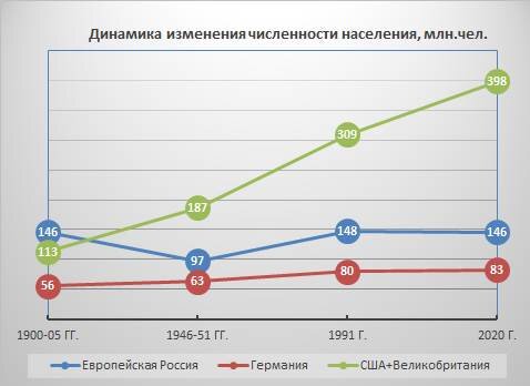 Я подготовил график демографической динамики России (брал статистику европейской её части), Германии и объединённых Великобритании с США. Учитывал данные начиная с 1900-го года. Вот как он выглядит: