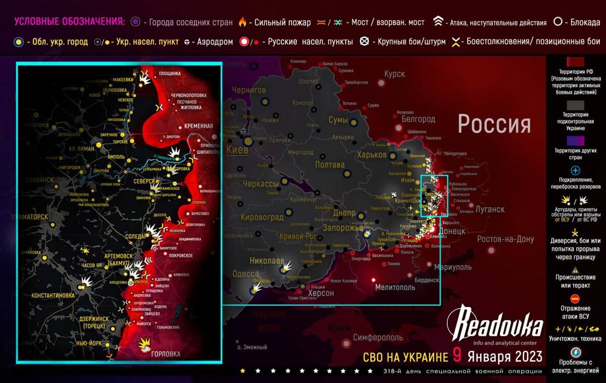 Карта военных действий 9 января ⚫️ Сватово-Кременное направление Русская армия отработала по скоплениям нацистов в районах Синьковки, Кисловки, Берестового Харьковской области и Новоселовского ЛНР. Также в районе Двуречной Харьковской области ликвидирована вражеская ДРГ. Кроме того, ударами авиации поражены подразделения ВСУ в окрестностях Стельмаховки, Невского ЛНР, а также Серебрянки и Григоровки ДНР. ⚫️Соледарское направление «Оркестранты» ведут тяжелые бои в центре Соледара. На данный момент штурмовые подразделения ЧВК «Вагнер» сражаются за здание горадминистрации. Враг цепляется за позиции, бои идут на коротких дистанциях. Пока рано говорить о контроле большей части города. ⚫️Угледарское направление Севернее Павловки и Шевченко были обнаружены и уничтожены две ДРГ ВСУ. Также по скоплениям живой силы и техники боевиков нанесены удары в районе Новомихайловки.