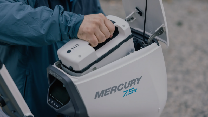 Новый подвесной электромотор представил производитель Mercury Marine (США). Название модели: "Avator 7.5 Е" Этот электромотор имеет сменные аккумуляторы 1 кВт/ч, устанавливаемые "под колпаком" (под крышкой капота). Мощность эл.мотора 750 Вт. Производитель заявляет, что динамические характеристики этого мотора соответствуют бензиновому 4Т ПЛМ в 3,5 л.с. Готовятся к выпуску и более мощные модели "20 Е" и "35 Е" - мощностью 2 и 3,5 кВт соответственно. Mercury Marine заявляет, что это первый подвесной электромотор с поперечным потоком. Эта технология обеспечивает надежную бесшумную работу и высокий крутящий момент. Инженер Эндрю Пшибыл так описывает своё детище: Информативный цветной монитор управления. Румпель, одновременно, является удобной ручкой для переноски мотора. Пользователь не только может видеть полную информацию о запасе хода (остатке заряда батарей), но и - подключив смартфон, может управлять ходом лодки. А так же, планировать маршрут с помощью GPS. То есть, ещё не отчалив от