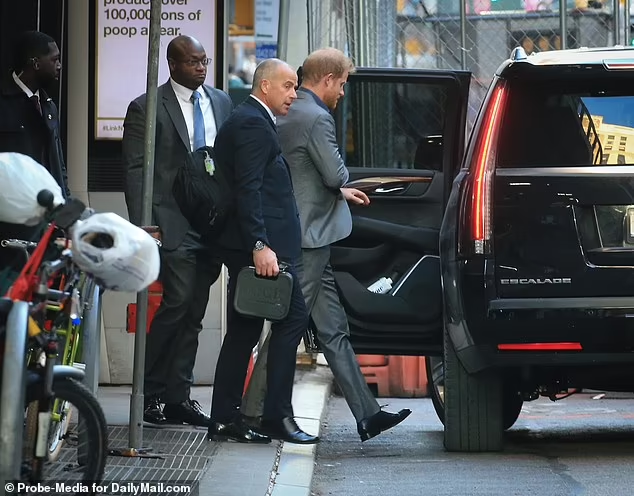 Принц Гарри в окружении охраны прибыл на интервью со Стивеном Колбертом, довольный и счастливый