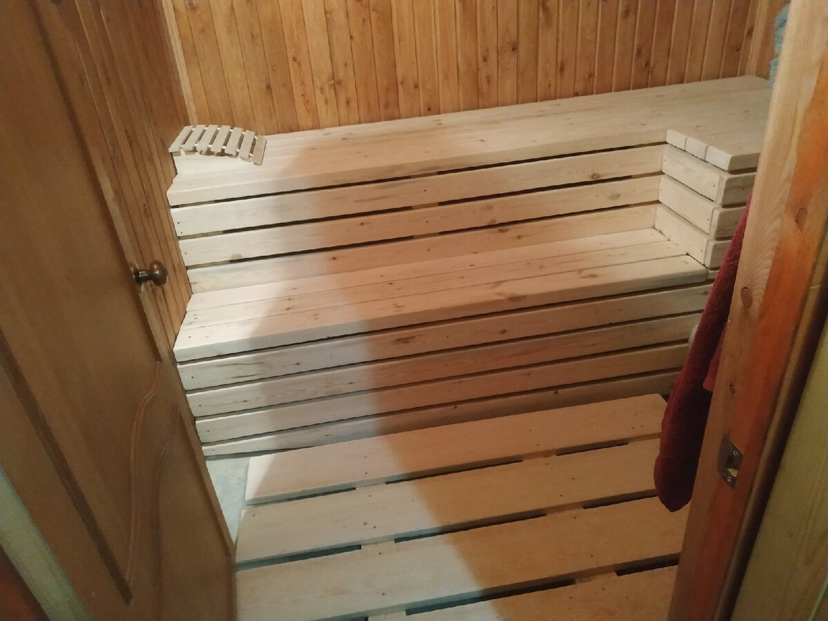 А вот полок я маслом не покрыл и там все это остается. Поэтому в ближайшее тепло, я его тоже покрою таким маслом, но уже прозрачным.