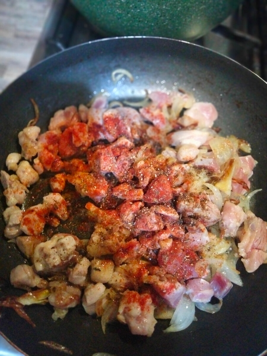 Здравствуйте! Если вы не готовили такой ароматный, согревающий супчик, самое время сделать это, зима же на дворе. Это шикарный суп, даже по мнению моего сына, который его, собственно, и доел. В далекие времена я готовила подобный суп с говядиной, получается прекрасно. На этот раз приготовила маленькую кастрюльку в 2 литра с курицей. Это не второе блюдо, но и не жиденький супчик. В общем, сытно, вкусно, ярко, как мы любим. На сковороде сначала поджарила лук, нарезанный перьями, потом туда же отправила кусочки курицы. У меня было две голени, одна из магазина, одна от домашнего бройлера, с них и срезала. Когда мясо изменило цвет, добавила молотую сладкую паприку, чесночный перец. Из овощей взяла пару картофелин, немного помидор и болгарского перца из заморозки, маленькую морковку. Все это нарезала на среднего размера кусочки. На одном яйце замесила крутое тесто на клецки. Мясо из сковороды отправила в кастрюлю, влила стакан воды, добавила лавровый лист и немного потушила. Потом туда доба