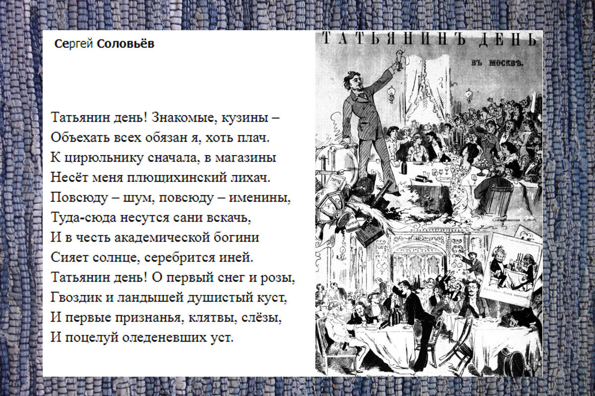 Сегодня Татьянин день. Поздравляю всех с праздником) Он шире, чем кажется. Ведь сегодня его отмечают не только те, кого зовут Таня, но и все студенты. А в 19 веке к ним присоединялись и те, кто когда-либо был студентом, то есть практически все дворяне. Праздник отмечался широко, особенно в Москве и Петербурге. Вот как описывает Татьянин день Соловьев: Обратите внимание на рисунок. На нем изображен студент медицинского университета Антон Чехов в Татьянин день. Нарисовал молодого писателя его брат, Н.П. Чехов, иллюстрируя его фельетон в журнале "Будильник" (1882 г.) Продолжим тему стихов начала 20 века. Это эпоха весьма раскрепощенная. Поэты не стеснялись описывать весьма личные моменты. Например, Брюсов. Он, конечно, был женат, но кого это смущало? В списке его романов, весьма длинном, я не нашла имени той, кому посвящено это стихотворение. Загадочная Таня промелькнула и осталась в веках: А вот стихотворение Есенина. Он верен своему стилю, похожему на народные песни. Героиню зовут Танюш