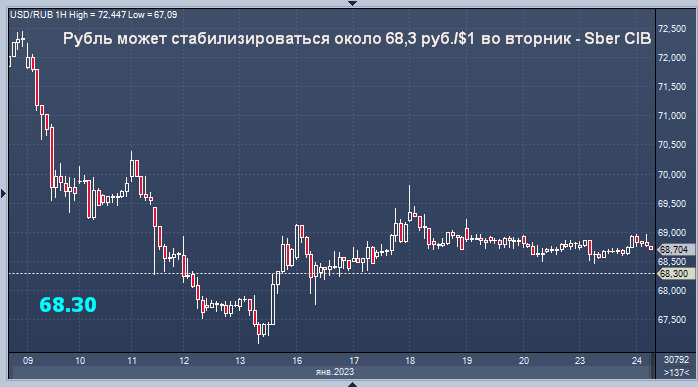 Курс рубля может стабилизироваться около 68,3 руб./$1 во вторник - Sber CIB Курс доллар/рубля на Мосбирже интервалами в 1 минуту Курс доллар/рубля на Forex интервалами в 4 часа Тенденция к укреплению рубля, вероятно, останется в силе в течение торговой сессии во вторник, и курс национальной валюты сможет стабилизироваться около уровня 68,3 руб./$1, считают эксперты Sber CIB. Доходности ОФЗ во вторник, по мнению экспертов инвестбанка, могут подняться еще на несколько базисных пунктов, как это обычно бывает в последнее время в день объявления условий аукционов Минфина РФ. Снижению нефтяных котировок, по мнению аналитиков Sber CIB, будет препятствовать ожидающееся на текущей неделе введение предельных уровней цен на нефтепродукты из России. Кроме того, в России готовятся контрмеры против "потолка" цен на нефть, отмечают в Сбербанке. MarketSnapshot - Новости ProFinance.Ru и события рынка в Telegram По теме: Курс рубля резко взлетел: Россия возобновит валютные интервенции с продажей китайск