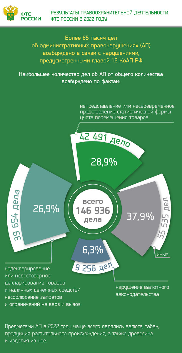 В 2022 году выросло количество дел, возбуждаемых таможенными органами по линии административного производства (АП). По результатам прошлого года таможенниками возбуждено 146 936 дел, что почти на 6% превышает показатели 2021 года. При этом 50% дел приходится на юридических лиц. Предметами АП в 2022 году чаще всего являлись валюта, табак, продукция растительного происхождения, а также древесина и изделия из нее. Наибольшее количество дел об АП – 85 906 – возбуждено в связи с нарушениями, предусмотренными главой 16 КоАП РФ. Из них по фактам недекларирования либо недостоверного декларирования товаров – 25 190 дел (ст. 16.2 КоАП РФ). По фактам несоблюдения запретов и ограничений – 14 464 дела (ст. 16.3 КоАП РФ). Кроме того, таможенными органами возбуждено 42 491 дело за непредставление или несвоевременное представление в таможенный орган статистической формы учета перемещения товаров (ст. 19.7.13 КоАП РФ) и