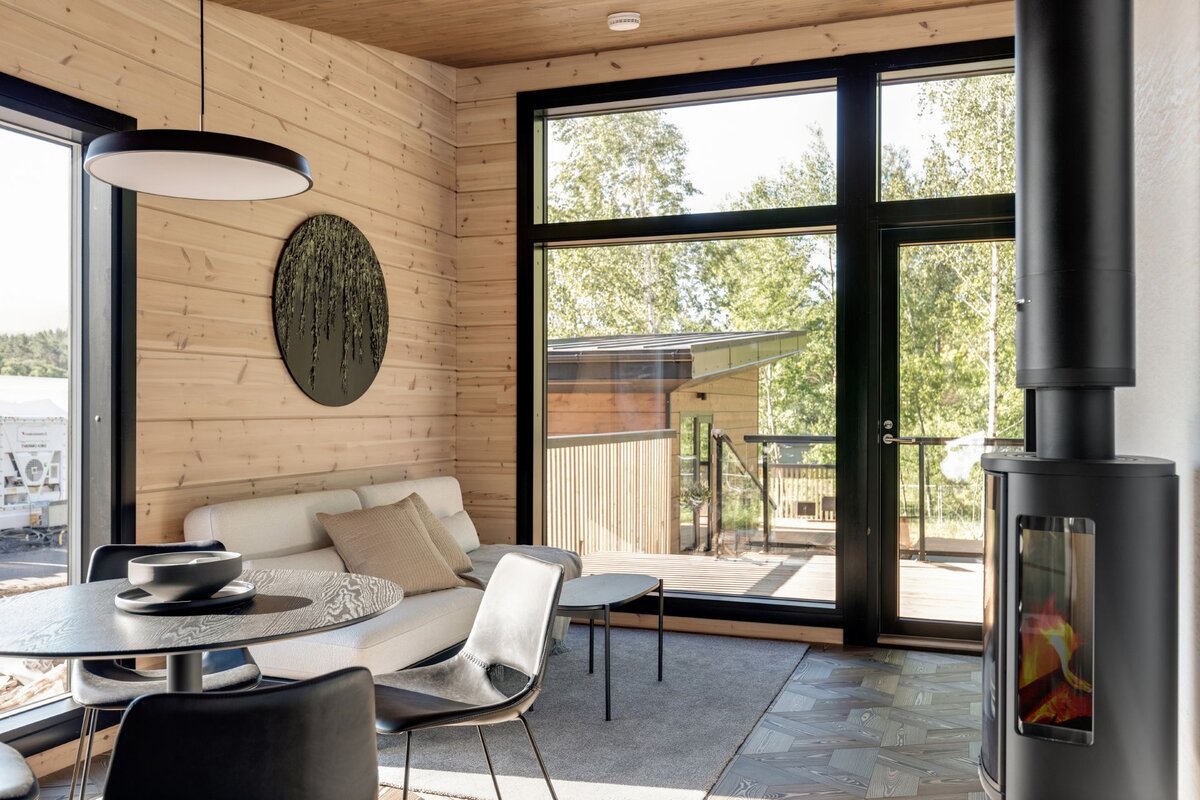 Декоративная внешняя отделка домам из клееного бруса не нужна. В целом, если вас устраивает жизнь в деревянном доме, и вам не хочется разнородных материалов и разнообразия видов отделки, то дома из клееного бруса предполагают отличную визуализацию концепции — построил, и заехал. Конечно, необходимо будет выкрасить стены и потолки. Краски могут быть, как укрывные, чтобы забить структуру дерева, так и лессирующие, чтобы оставить ее. По желанию, можно поработать с санузлами, например, положить там керамическую плитку, чтобы дополнительно защитить помещение от влаги. Стены же можно спрятать и зашить. Важно понимать, что вы ожидаете от интерьера. Единственный минус, если вы не предполагаете дополнительной отделки, это необходимость заранее продумать все коммуникации, особенно, это касается электрики. Но даже из такой ситуации есть выход, есть вариант так называемой «винтажной электропроводки» — если она вас устраивает, то тогда можно ни о чем не переживать и не думать заранее.
