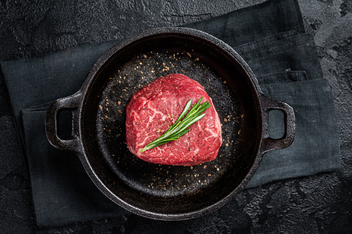 Для идеального стейка используют мясо только наивысшего качества. Про качество мяса обязательно скажет его цвет и консистенция. Свежая говядина будет иметь цвет спелой малины. Это природный цвет мяса. Также очень важно обратить внимание на оттенок жировых прослоек. У качественного мяса они имеют белый цвет. Желтый оттенок скажет о том, что животное не молодое, а это значит, мясо будет жестким.