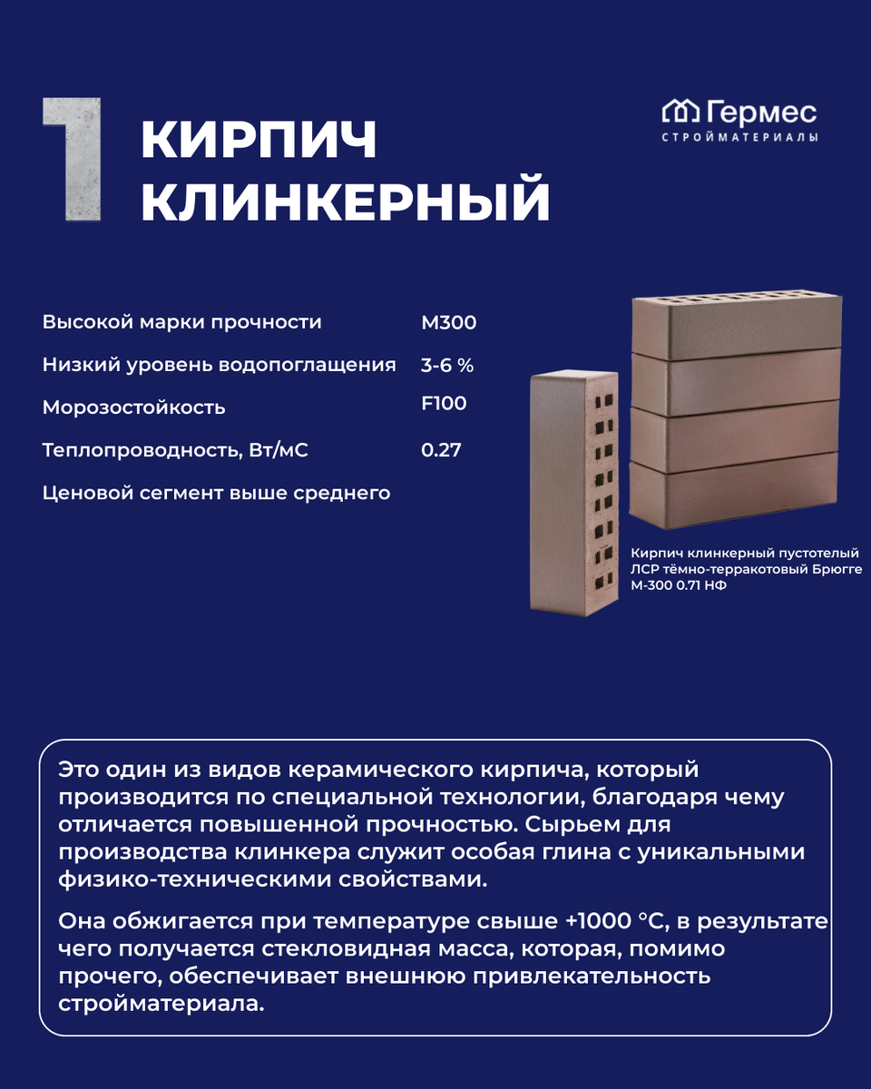 Начиная строительство собственного дома, достаточно долгое время приходится обдумывать какой материал выбрать, ведь построить дом удовольствие, которое зачастую бывает 1 раз в жизни. Чтобы облегчить выбор и сократить время на раздумья, мы отобрали материалы по теплопроводности, марки прочности, морозостойкости и другим характеристикам и составили рейтинг из самых прочных. 1. Клинкерный кирпич Это один из видов керамического кирпича, который производится по специальной технологии, благодаря чему отличается повышенной прочностью. Он обжигается при максимальных температурах и состоит из высших сортов глины. Клинкерная брусчатка - единственный керамический материал выдерживающий дорожные нагрузки. 2. Кирпич керамический Из него возводят дома для постоянного проживания, в том числе, многоэтажные, дачные домики, загородные коттеджи и другие частные строения. Материал отличается долговечностью, вариативностью размеров, простотой укладки, экологической безопасностью и высоким уровнем шумопогло
