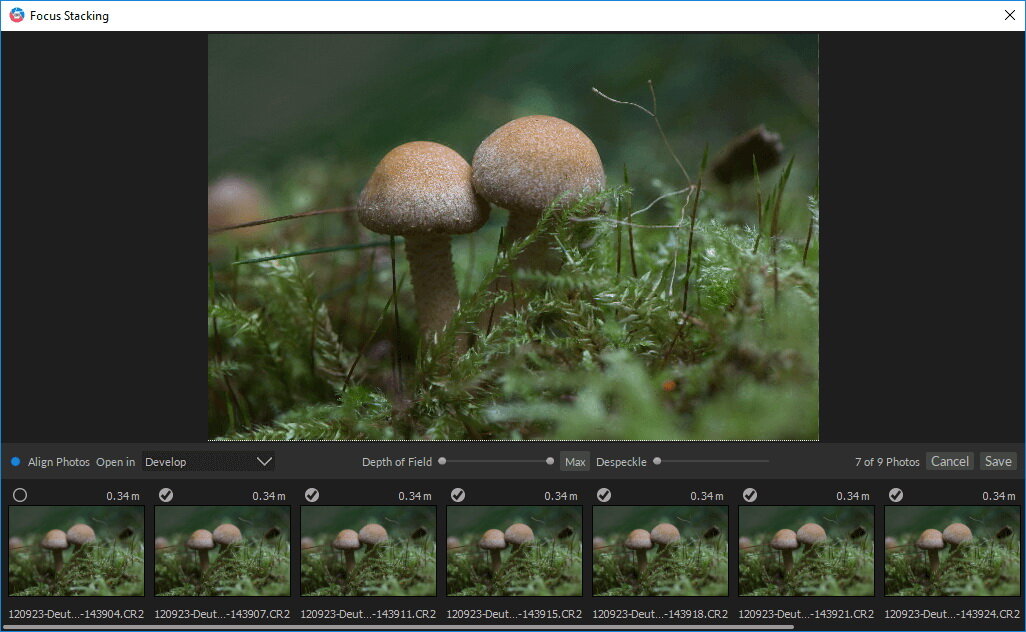 В наше время есть возможность сделать серию снимков с различной фокусировкой и совместить их сторонним программным обеспечением для увеличения глубины резкости. Такой подход полезен для макросъемки, где типичная глубина резкости для диафрагмы f/8 может составлять всего 1 мм, но объект при этом имеет большую глубину. Приложение ControlMyNikon может снять изображения, но не объединяет их. Оно может автоматически экспортировать снимки в Zerene Stacker, отличное приложение для фокус-стекинга, или можно вручную импортировать их в любые другие приложения для обработки.