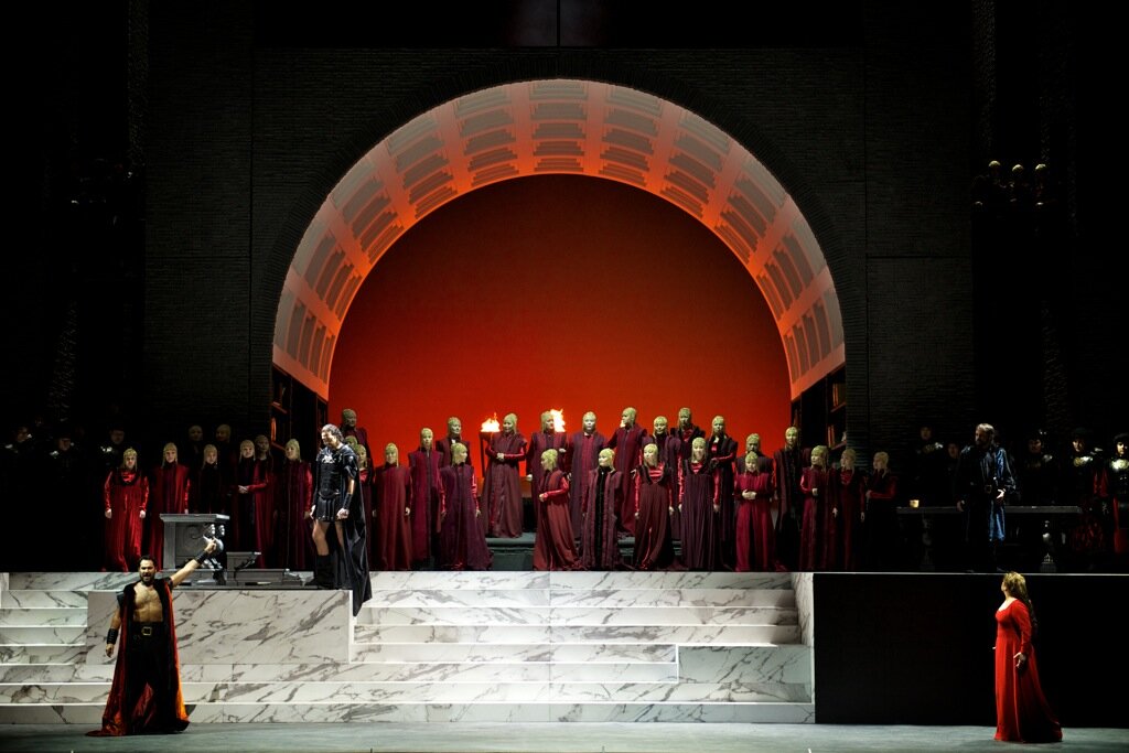 На этот раз геометрия несколькими условными штрихами даёт нам образ позднеантичной Италии: Аквилея ли, Рим это (согласно либретто), а может быть Верона или Равенна – не столь уж принципиально. У Пицци нет буквализма, географической дотошности, но есть чётко узнаваемый образ – мощный свод арки (триумфальной, а может быть акведука?), ступенчатый подъём на авансцене (такой же как на любом римском форуме, в любом амфитеатре), гигантский крест, символизирующий окончательный поворот древнего общества к новой религиозной идеологии. Из деталей своего сценографического «конструктора» для каждой картины Пицци создает особую, предназначенную именно для нее визуальную абстракцию, обыгрывая уникальную драматургическую ситуацию момента, наполняя мизансцены скульптурной точностью и завораживающей выразительностью.