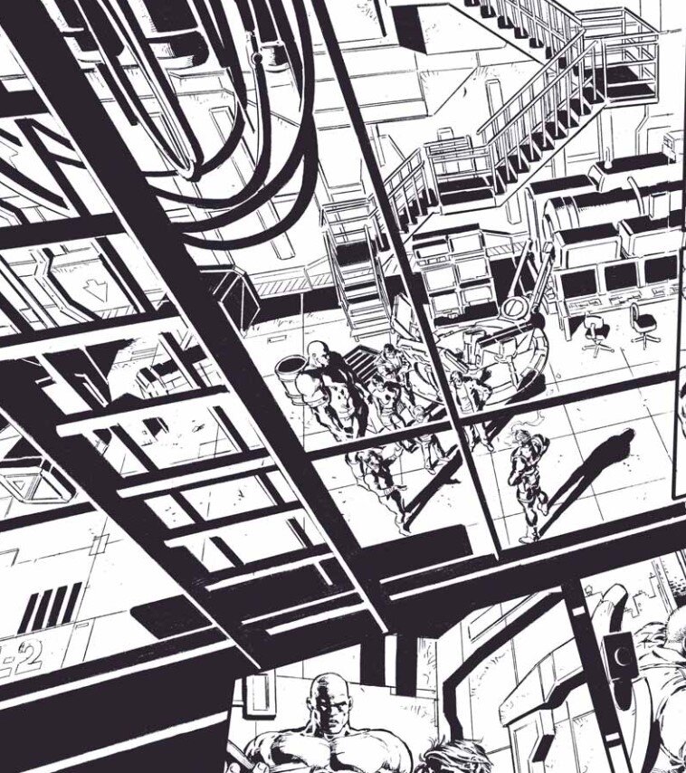 Предварительный сюжет страницы. Обычно делается в маленьком виде на отдельной бумажке, но отображает все происходящее, перспективу и действия персонажей.