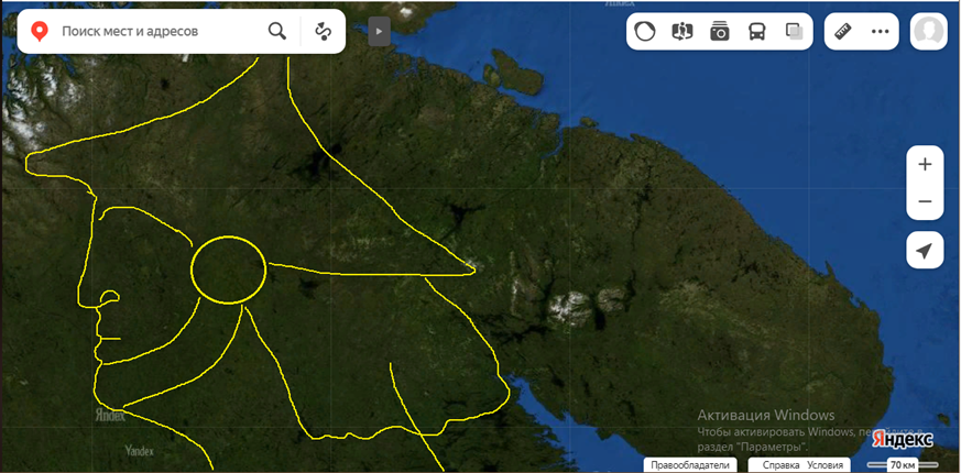 На погружной части мелководья указанных морей, объекты ВАКС не выявлены за исключением отдельных портретов. На материковой части России привлек внимание контур похожий на дерево Иггдрасиль.