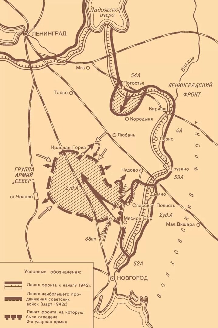 В январе попробовали наступать, сразу были выявлены проблемы: недостаток артиллерии, слабость авиации, недостаточное количество боеприпасов. Частично исправив ошибки, удалось со второй попытки прорвать оборону немцев, войска ушли в прорыв. Однако у врага был ответ: тактика "угловых столбов". Если вкратце, немцы удерживали позиции в основании прорыва, не давая его расширить, сдвинуть противника, у которого превосходство в артиллерии и автоматическом оружии (в первую очередь, в пулемётах), было крайне затруднительно. Армия же пыталась взять Любань: ключевой элемент системы снабжения врага, однако взять город не удалось, а противник в это время пытался окружить армию, к началу апреля коридор, через который снабжалась армия стал составлять 2,5 км. А 20 апреля в армию прибыл новый командир: А.А. Власов (тот самый, что перейдёт на службу к врагу). В мае армия постепенно отходит к Мясному Бору, где находится коридор, но 31 мая немцы его перерезают, коридор с перерывами действовал с 21 по 25 июня, хотя его ширина измерялась сотнями метров.