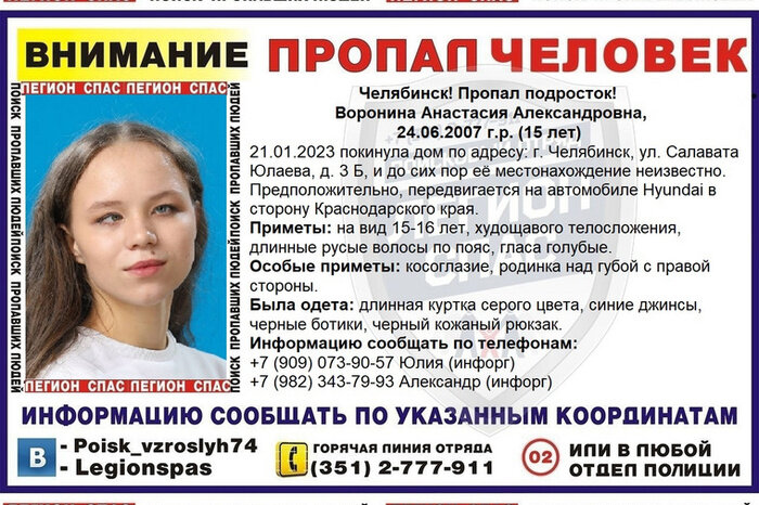 В Челябинске волонтёры разыскивают 15-летнюю Анастасию Воронину Александровну, ушедшую из дома 21 января. Она могла отправится на машине в Краснодарский край. - Передвигается в сторону Краснодарского края на машине Hyundai, — сообщает паблик «Легион-СПАС» — Поиск пропавших людей (74 рег)» во «Вконтакте». Приметы девочки: худощавое телосложение, длинные русые волосы, голубые глаза, родинка над губой справа. Из особых примет - косоглазие. На момент пропажи была одета в длинную серую куртку, синие джинсы, черные ботинки. Всех, кто что-либо знает о местонахождении пропавшей, просят позвонить по телефонам, указанным в ориентировке. Ранее в Свердловской области завершили поиски 10-летнего мальчика.